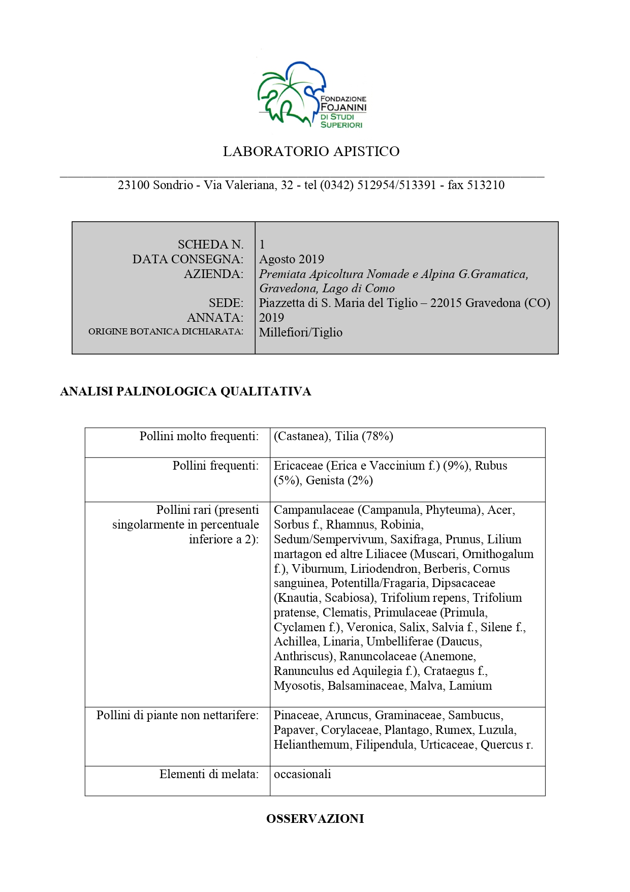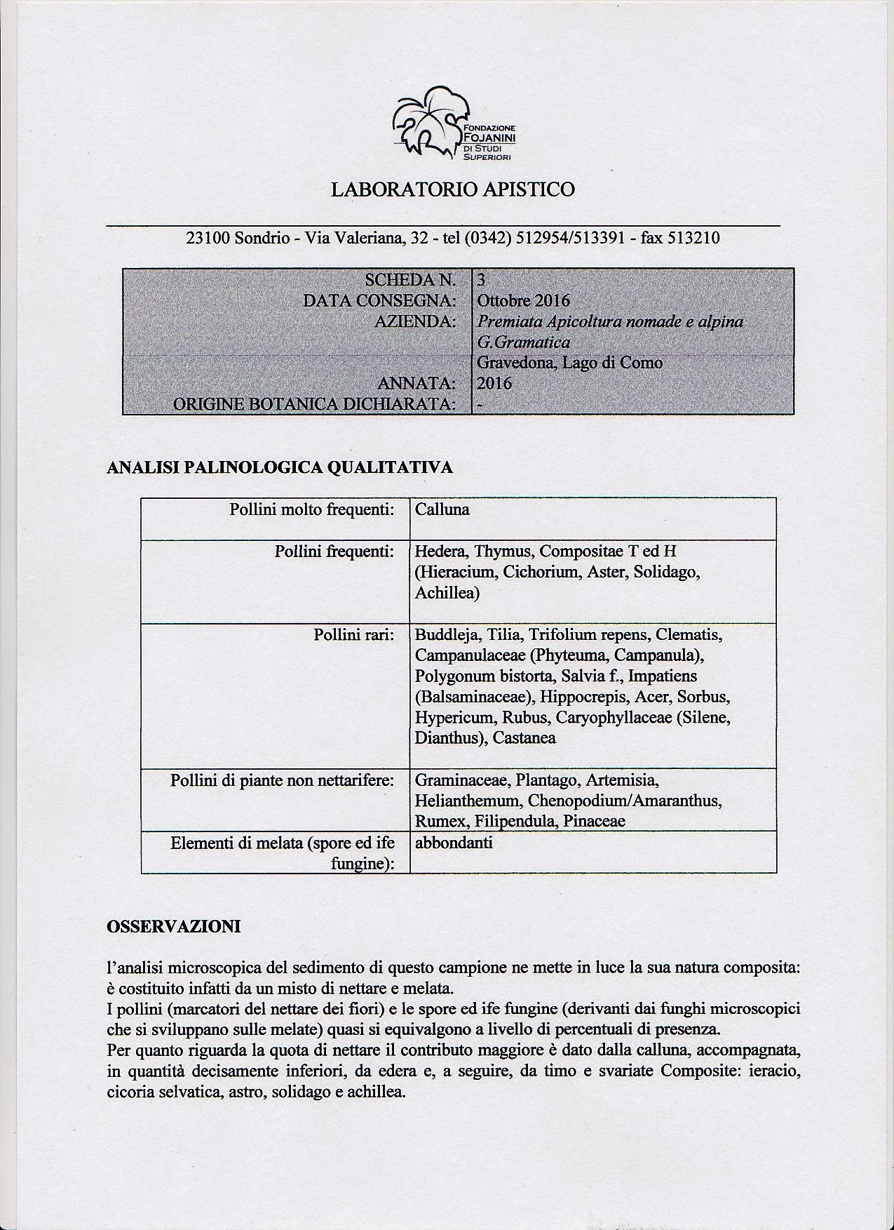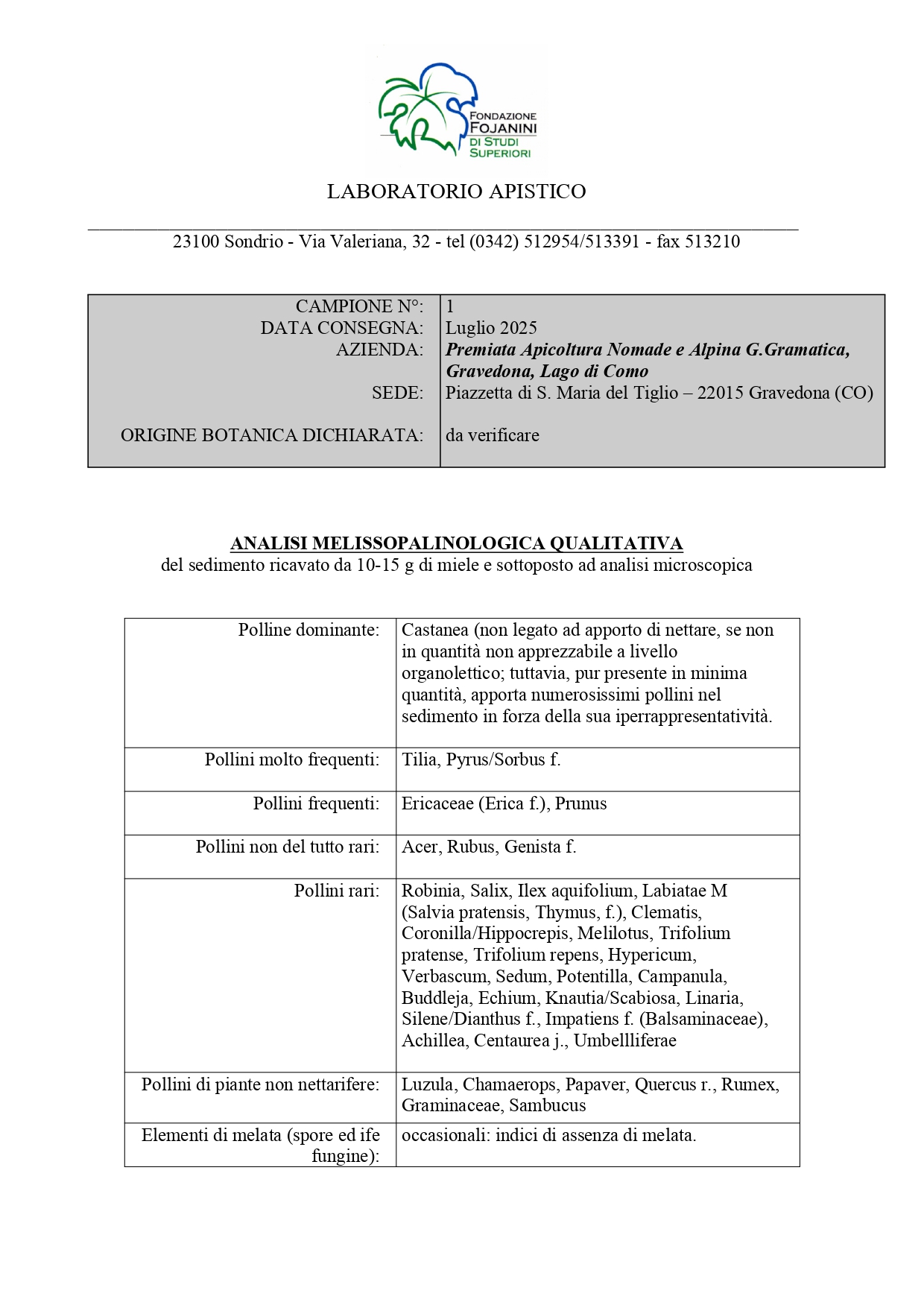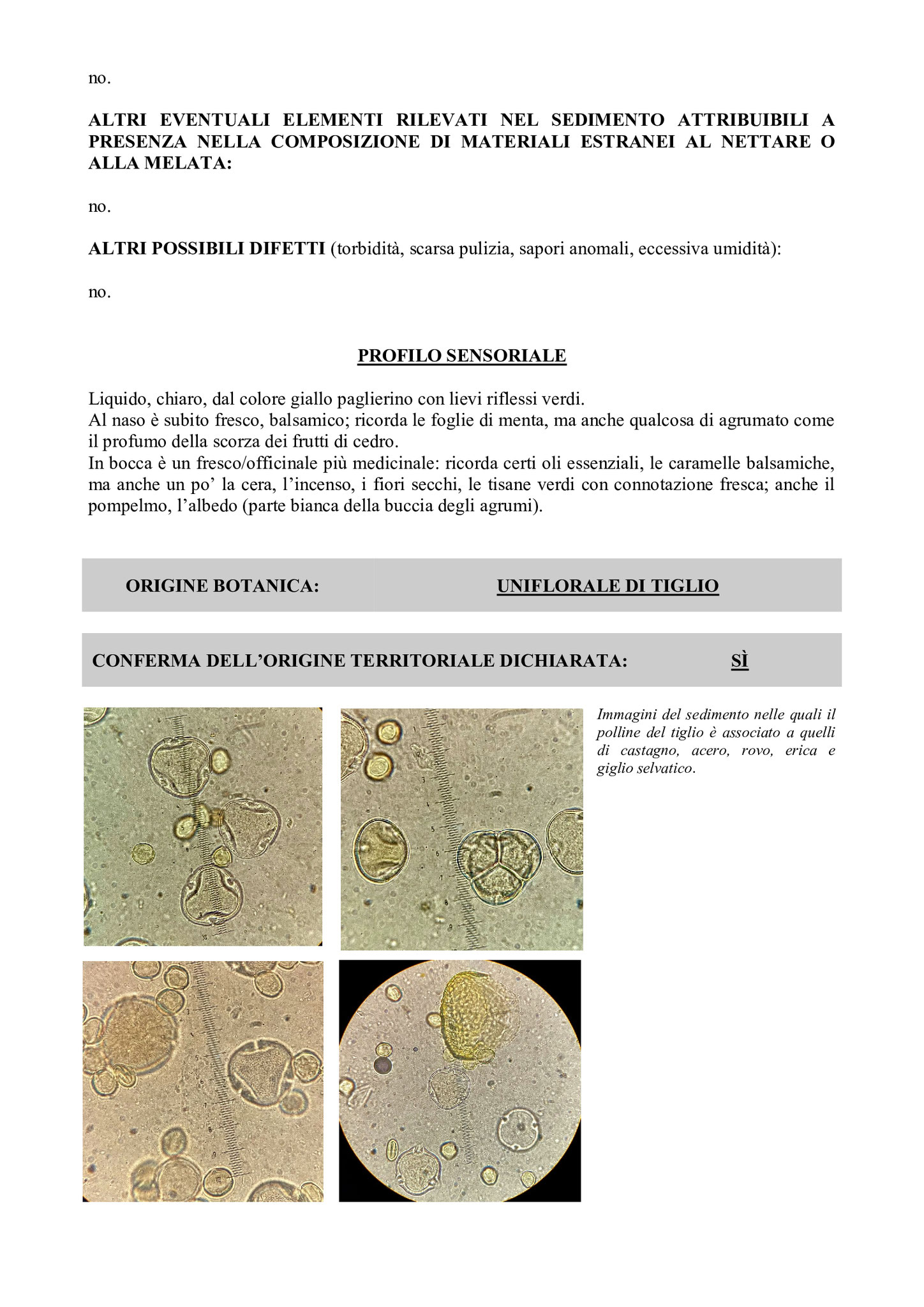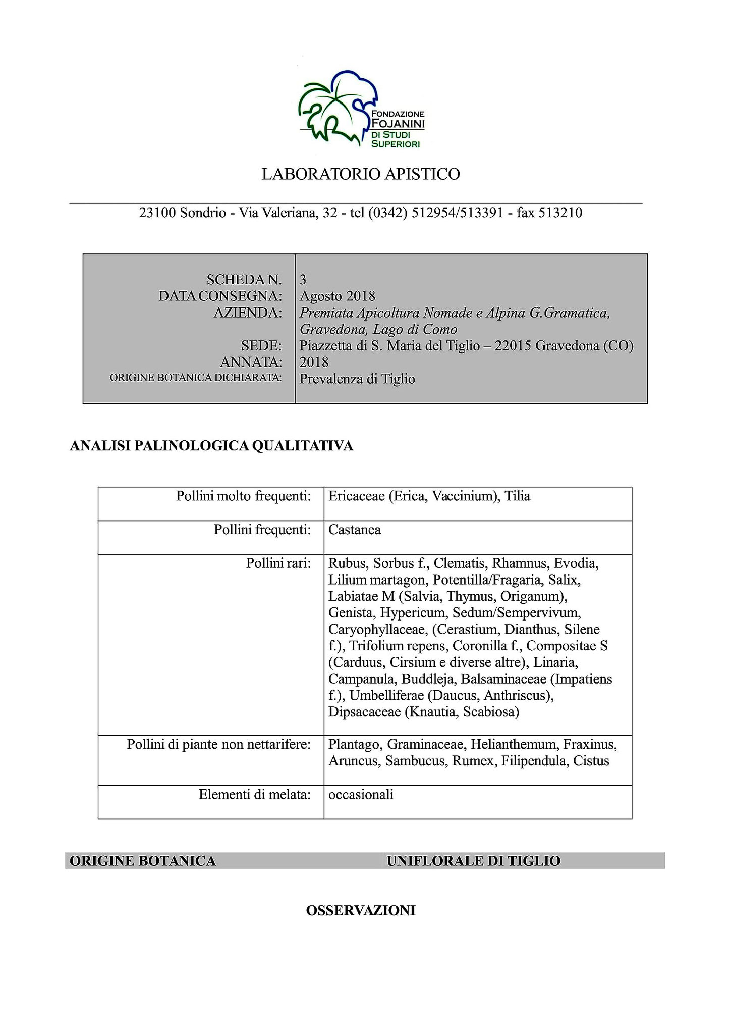 In ogni confezione viene acclusa la certificazione dell'origine botanica e l'analisi palinologica qualitativa dei mieli di Tiglio e Millefiori compiuta nell'agosto 2014 dal Laboratorio Apistico dell'Istituto FOJANINI di Sondrio. (vedi sotto)
