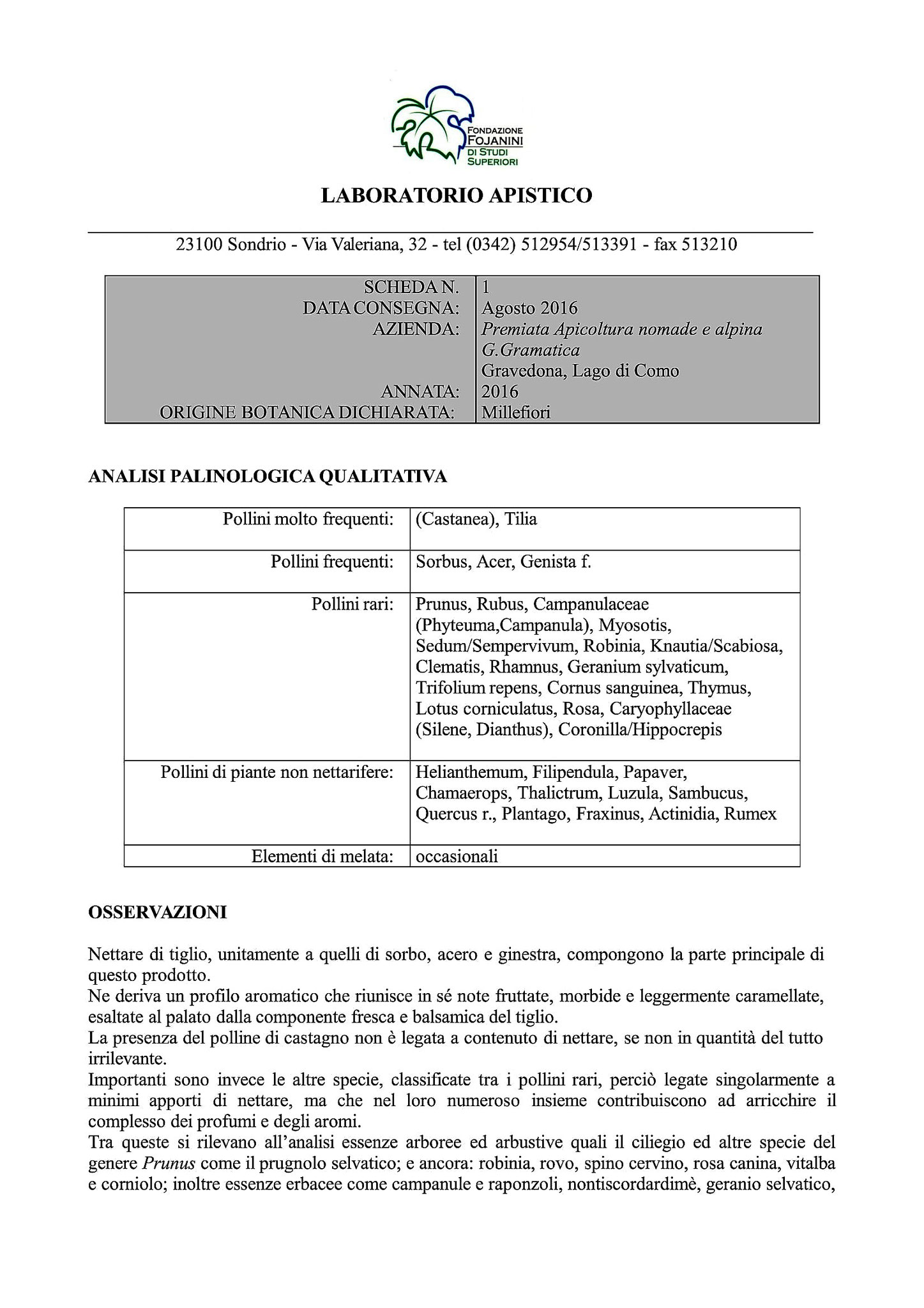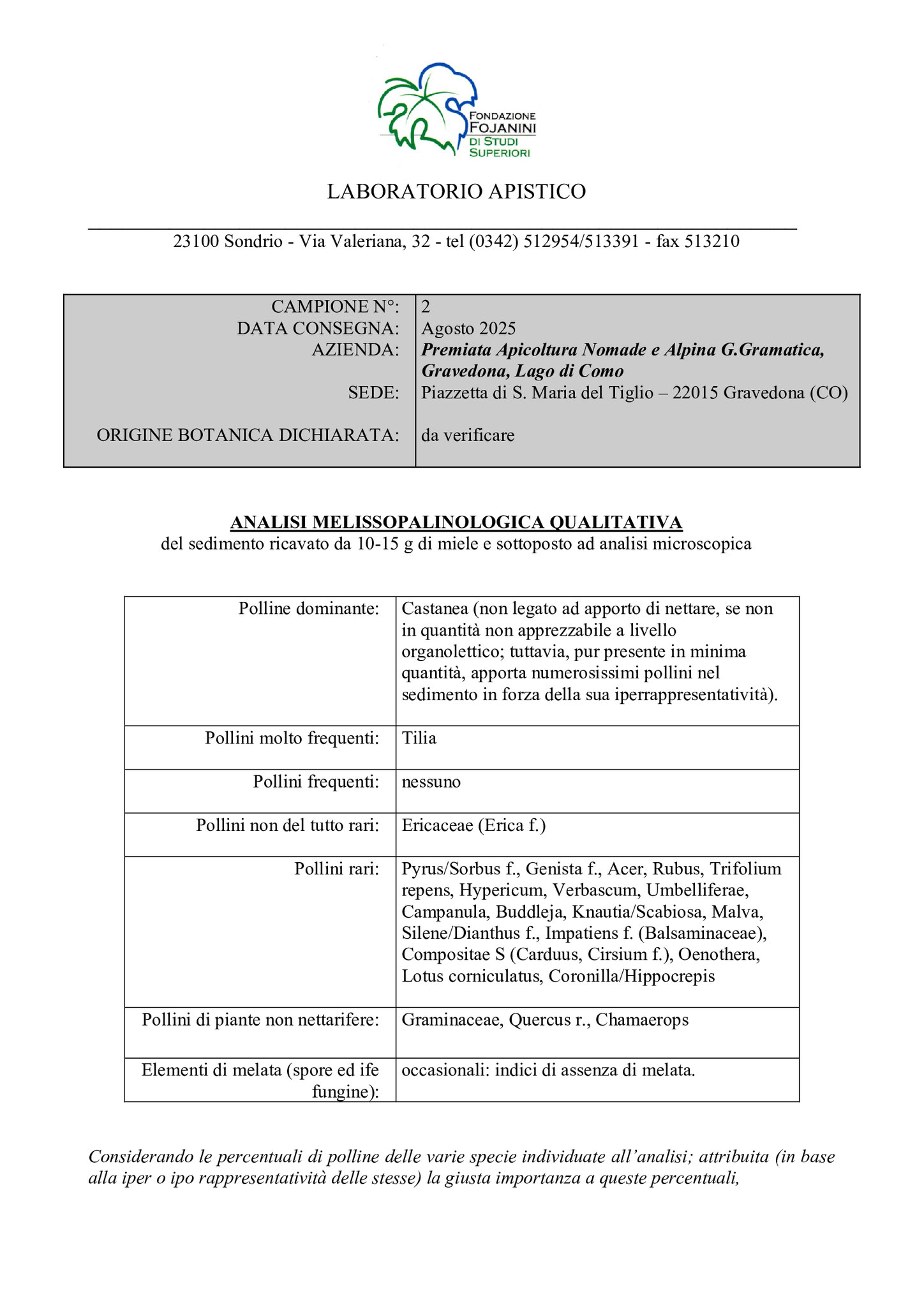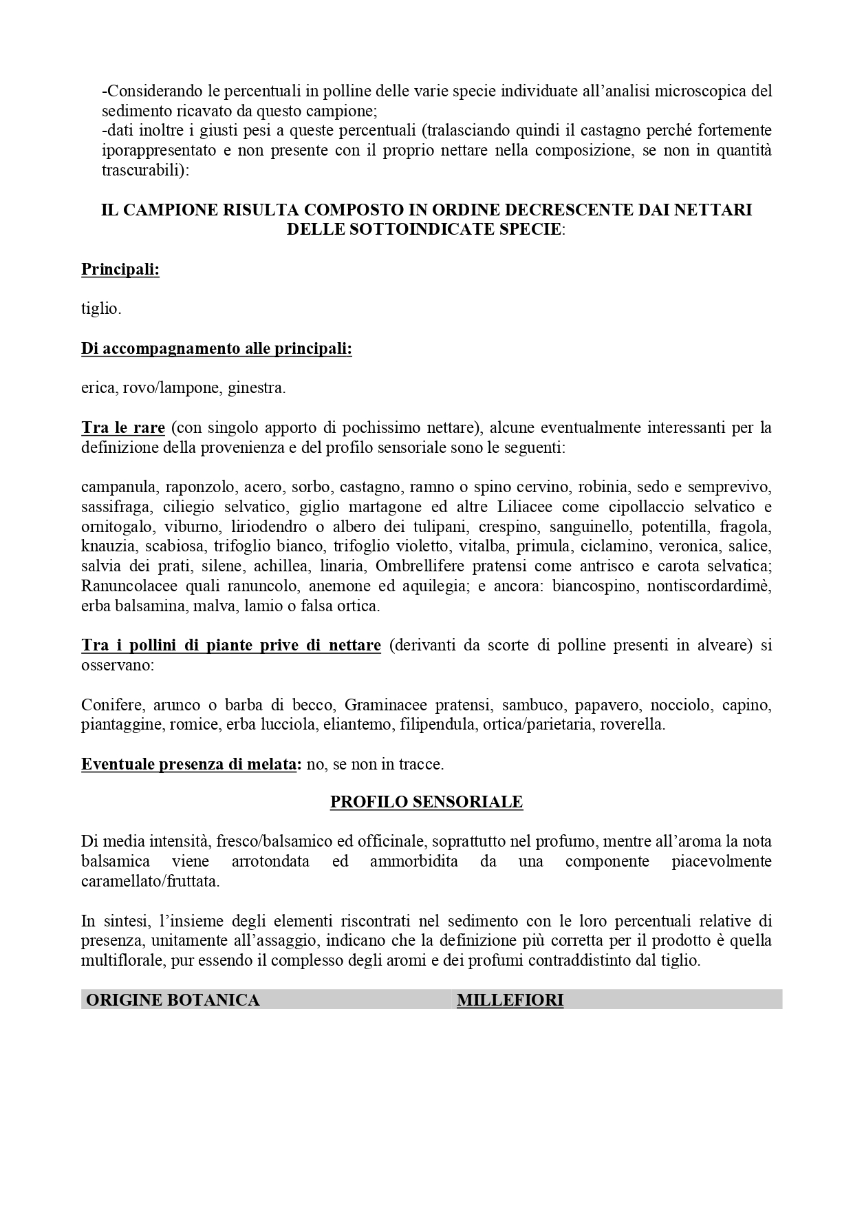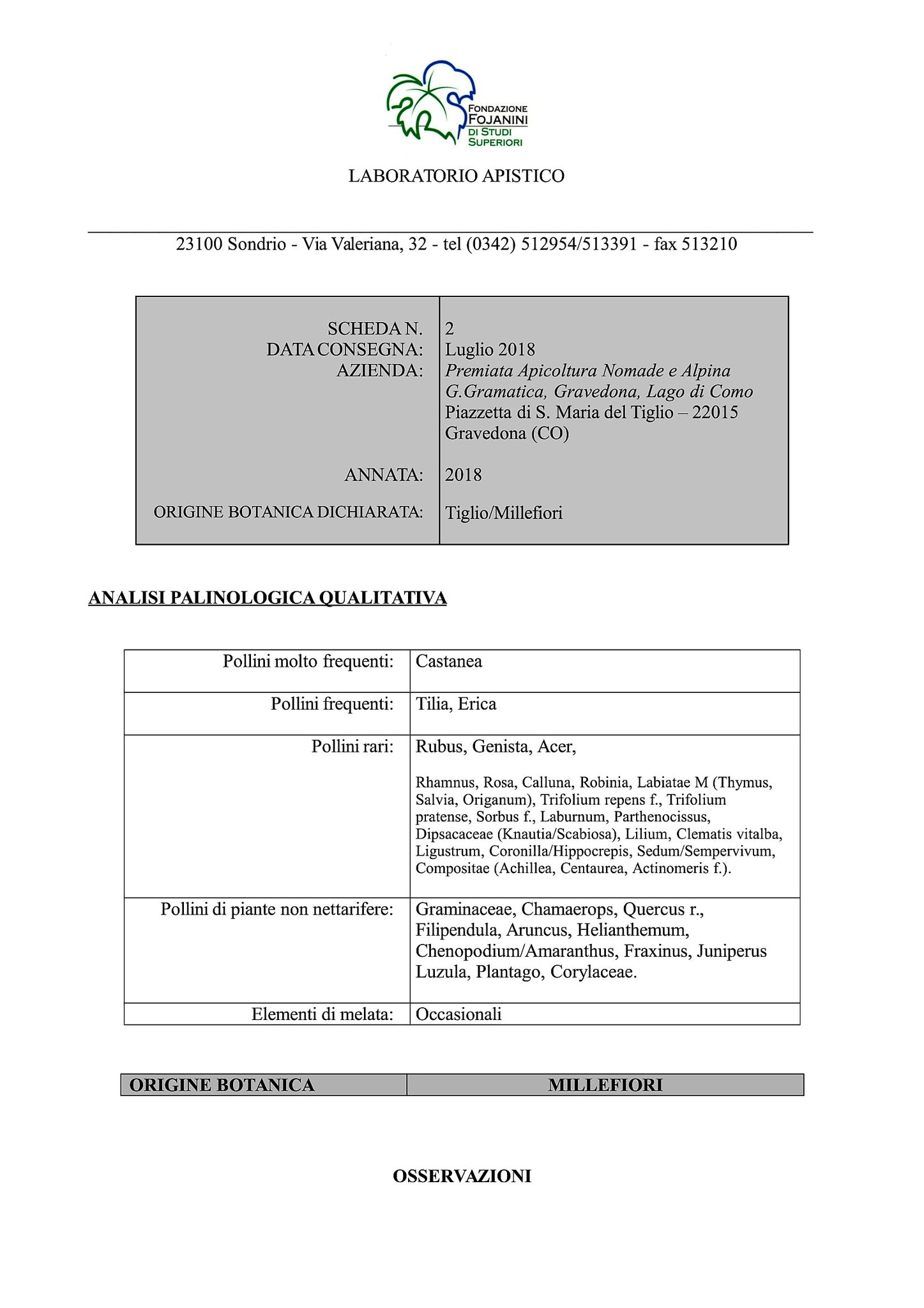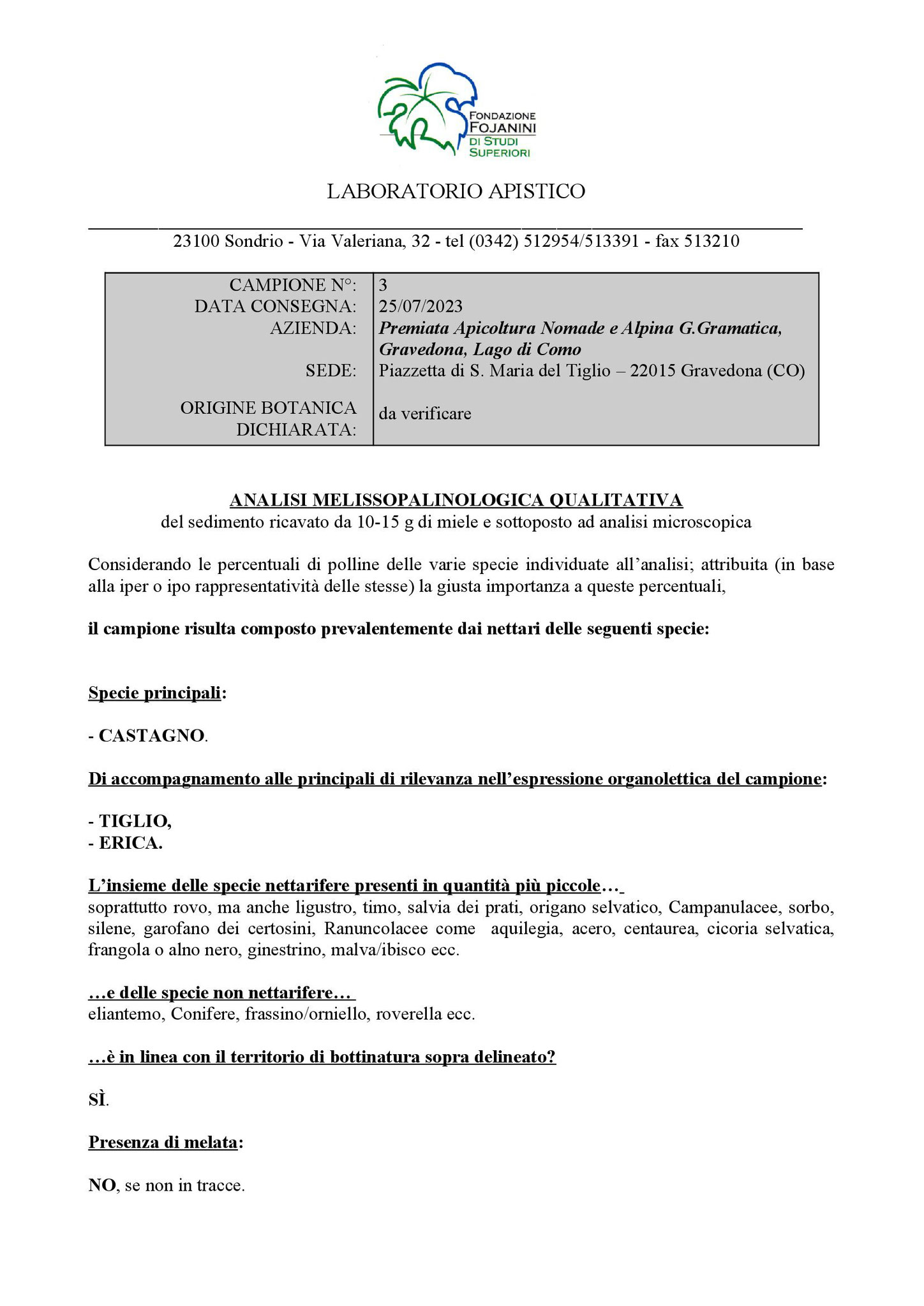In ogni confezione viene acclusa la certificazione dell'origine botanica e l'analisi palinologica qualitativa dei mieli di Tiglio e Millefiori compiuta nell'agosto 2014 dal Laboratorio Apistico dell'Istituto FOJANINI di Sondrio. (vedi sotto)