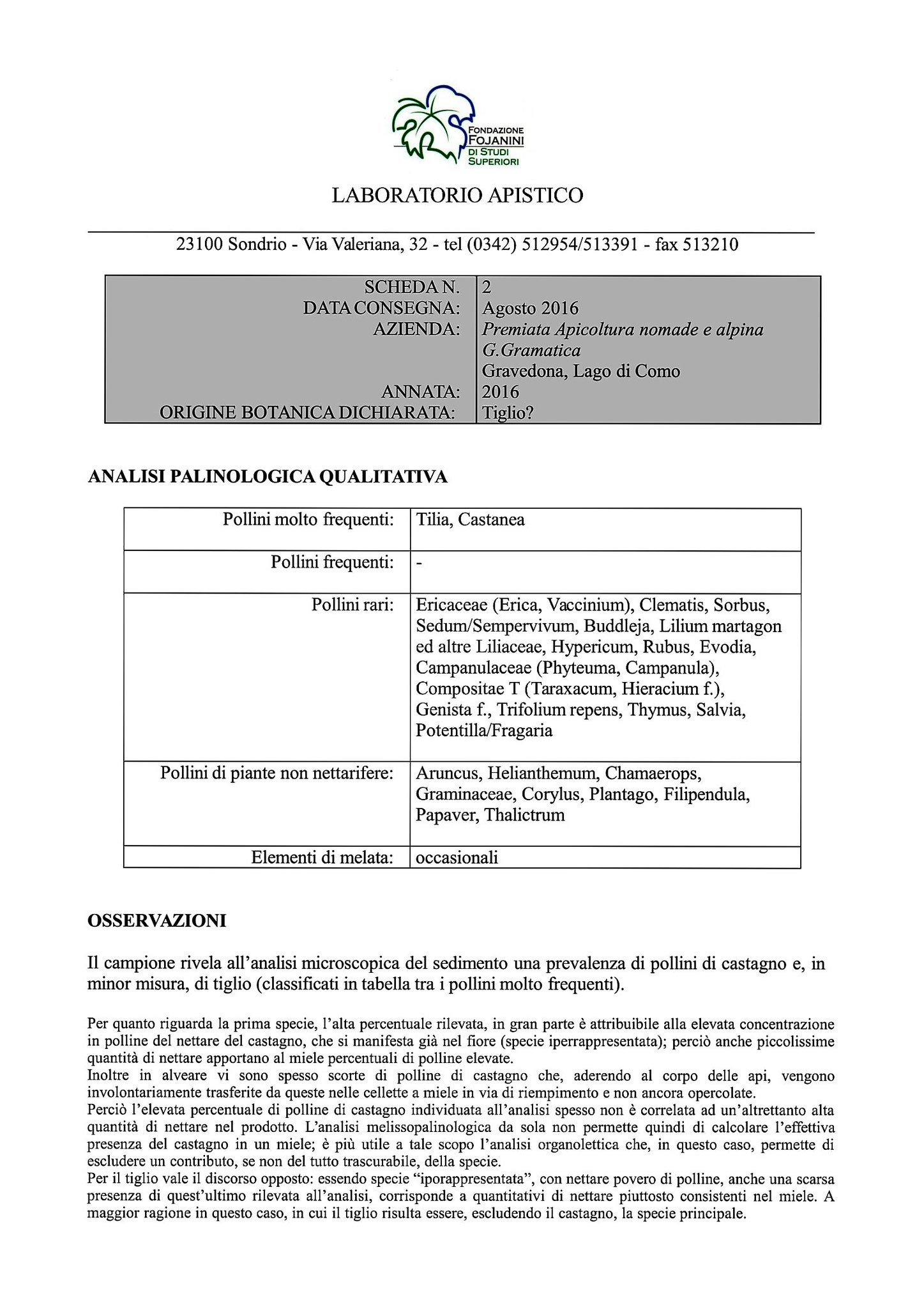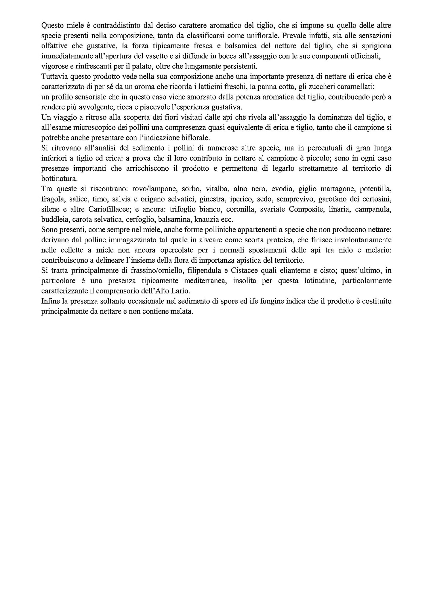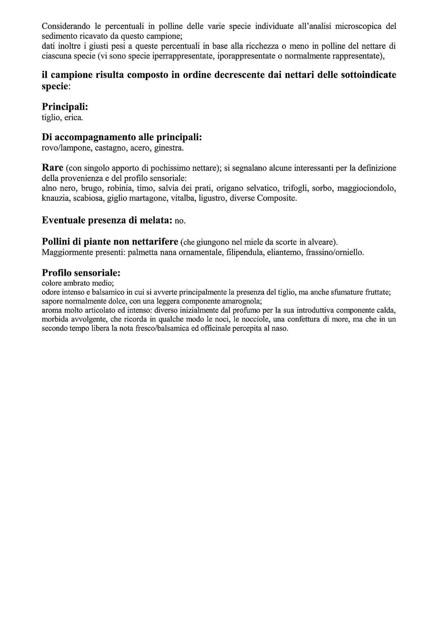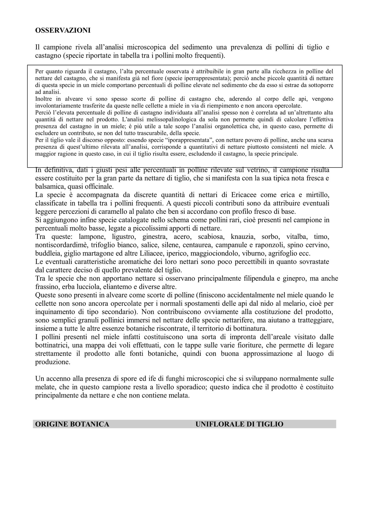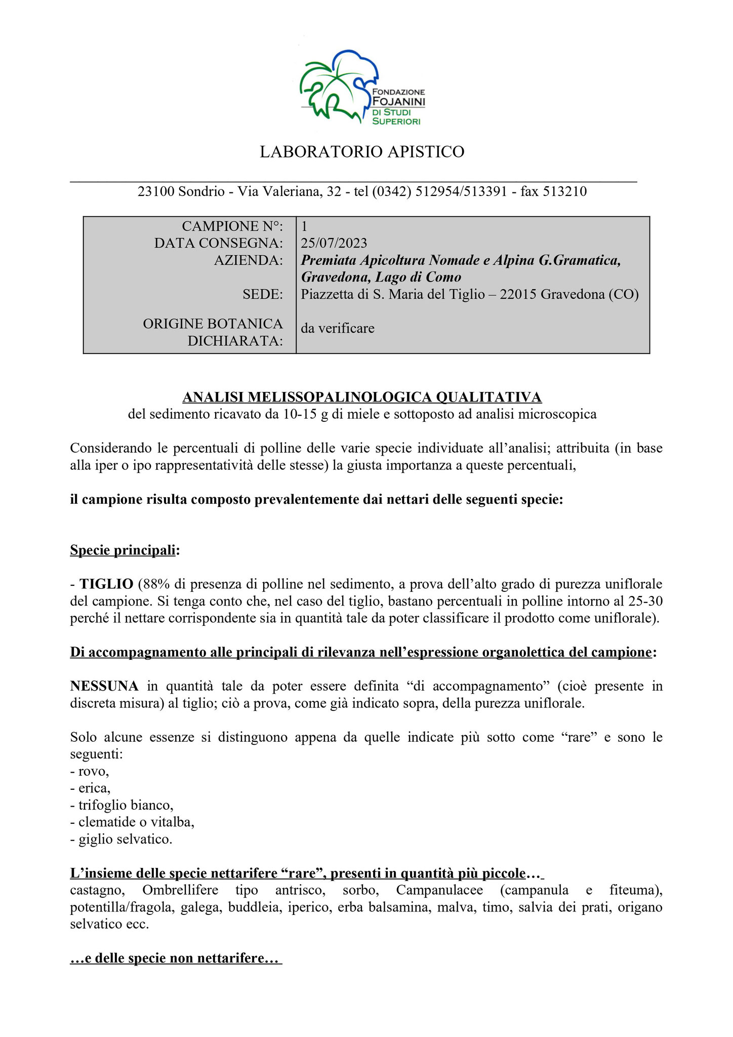 In ogni confezione viene acclusa la certificazione dell'origine botanica e l'analisi palinologica qualitativa dei mieli di Tiglio e Millefiori compiuta nell'agosto 2014 dal Laboratorio Apistico dell'Istituto FOJANINI di Sondrio. (vedi sotto)