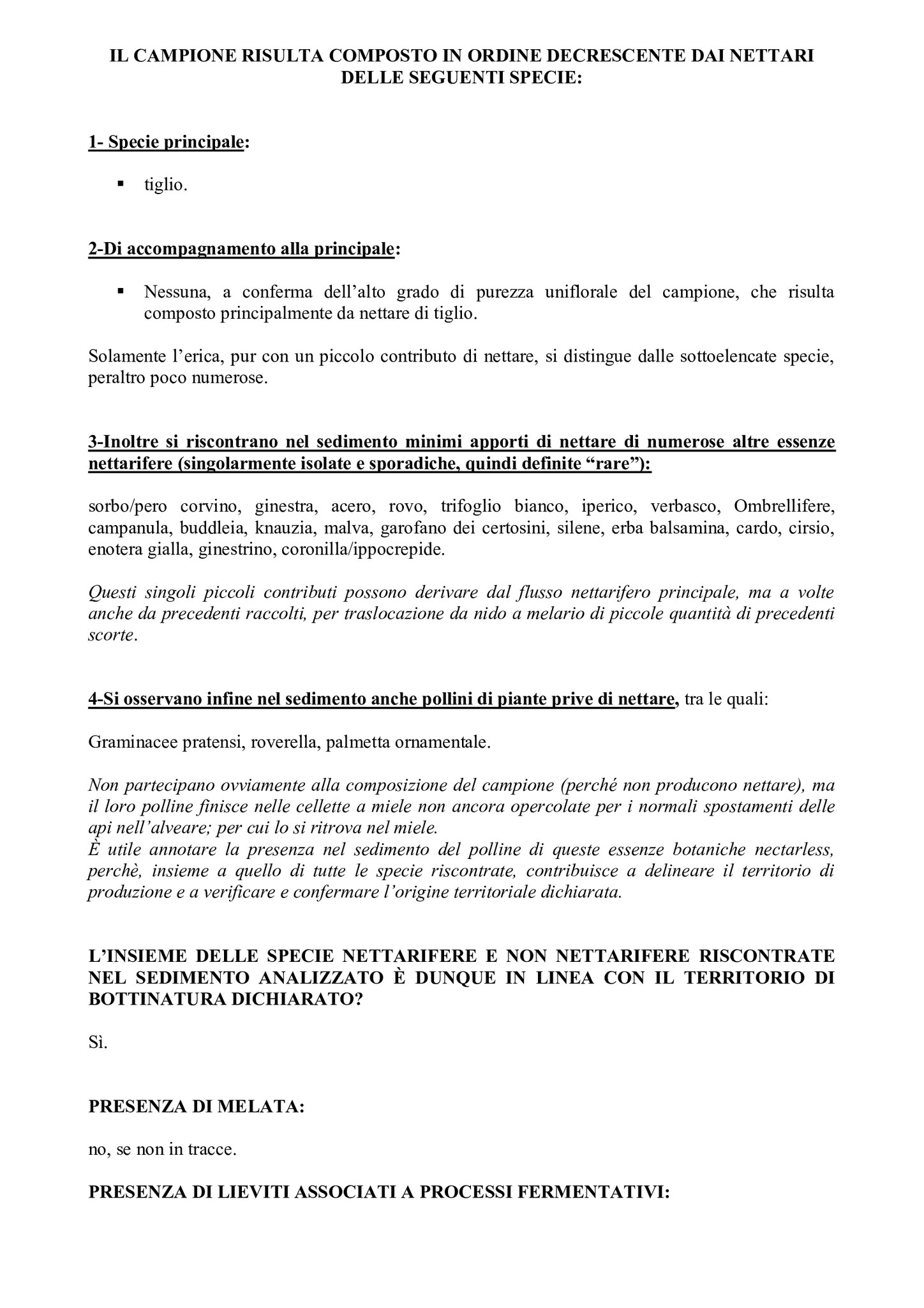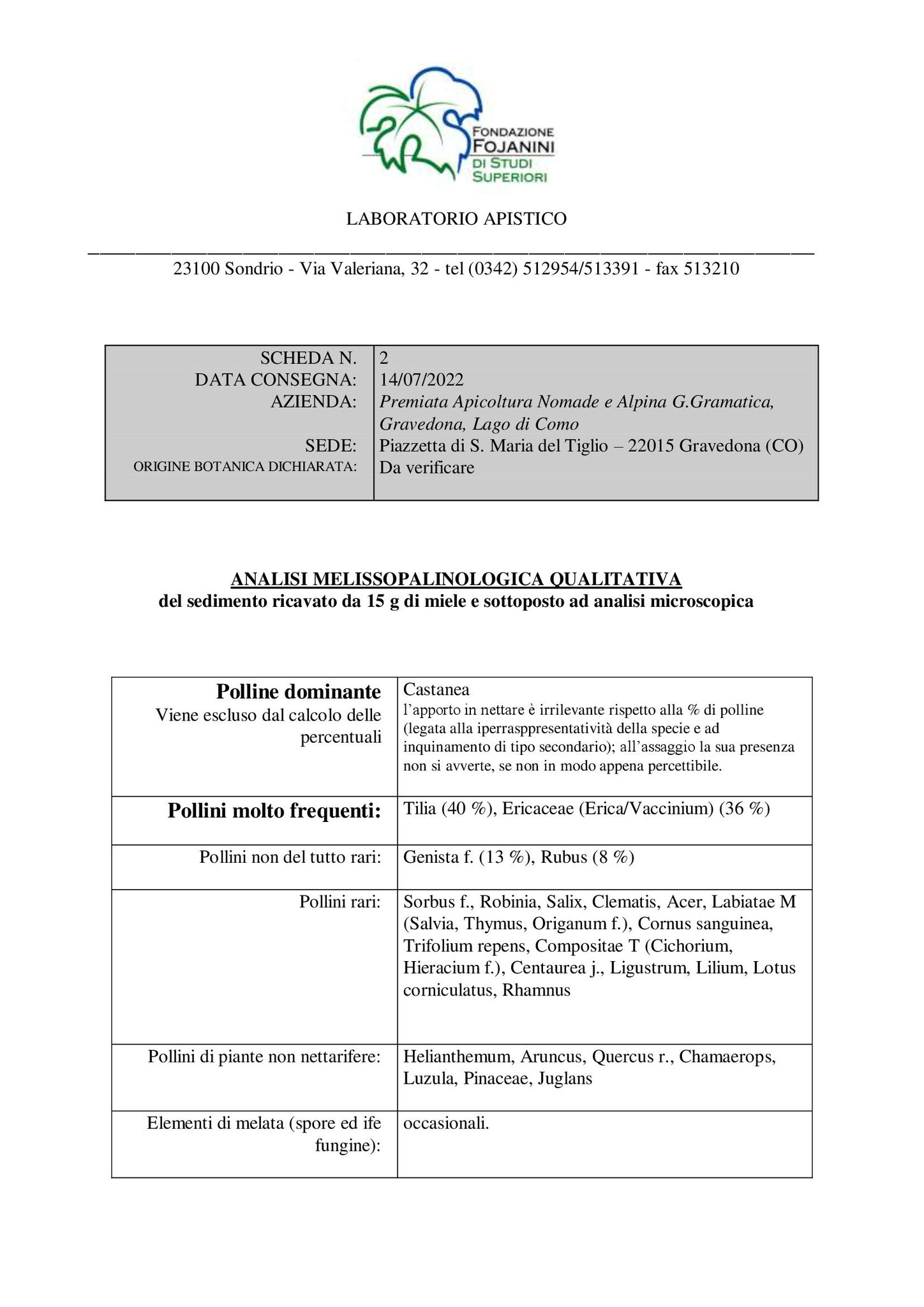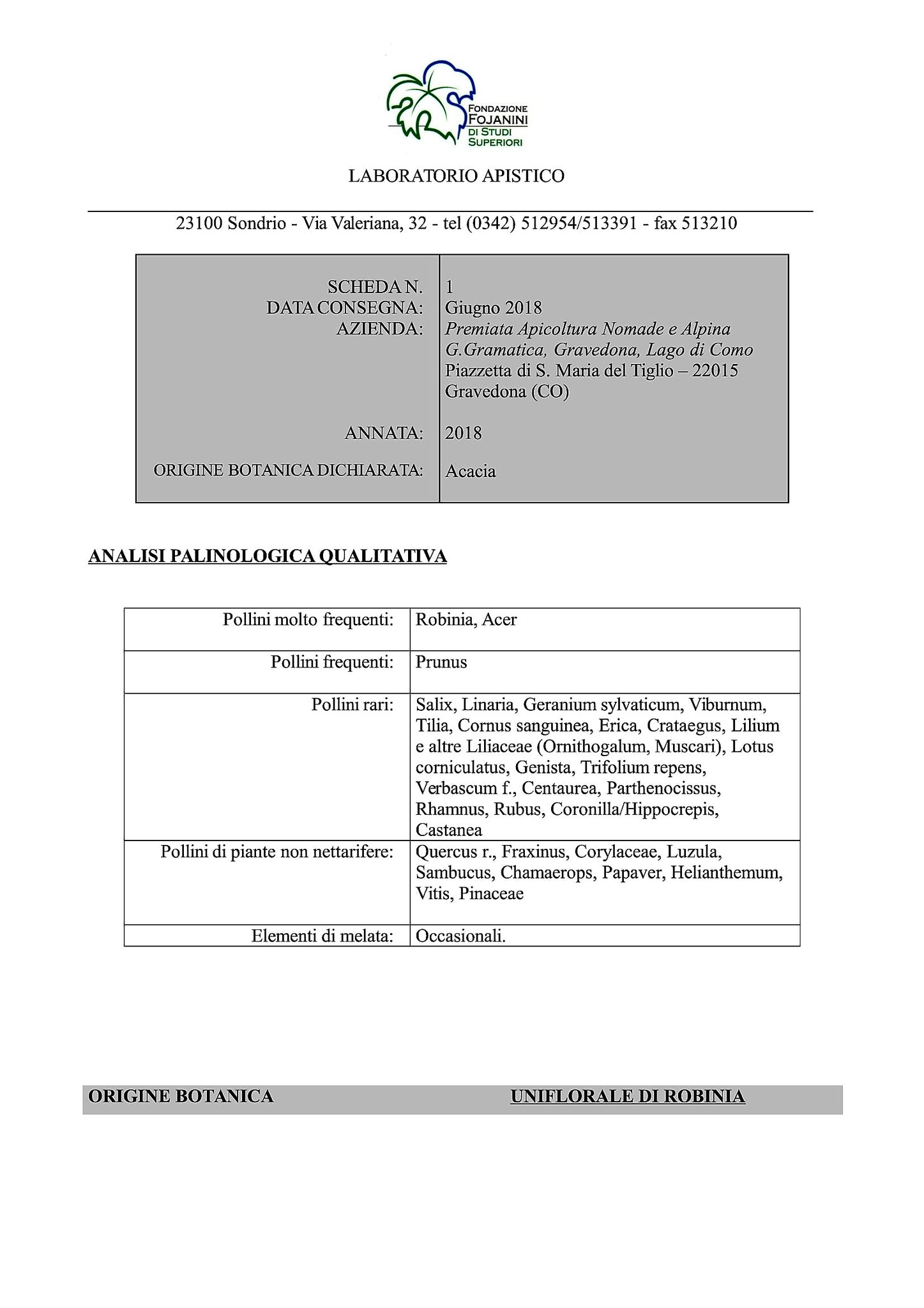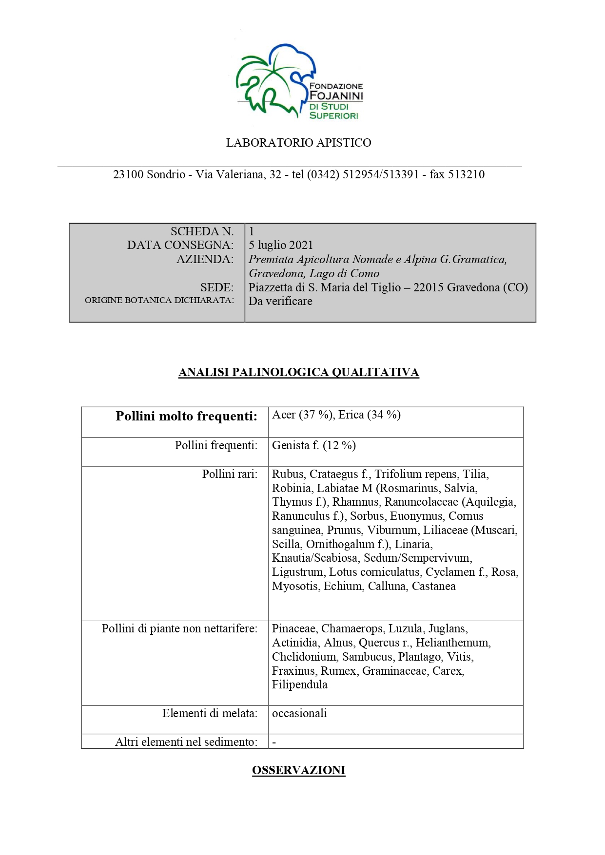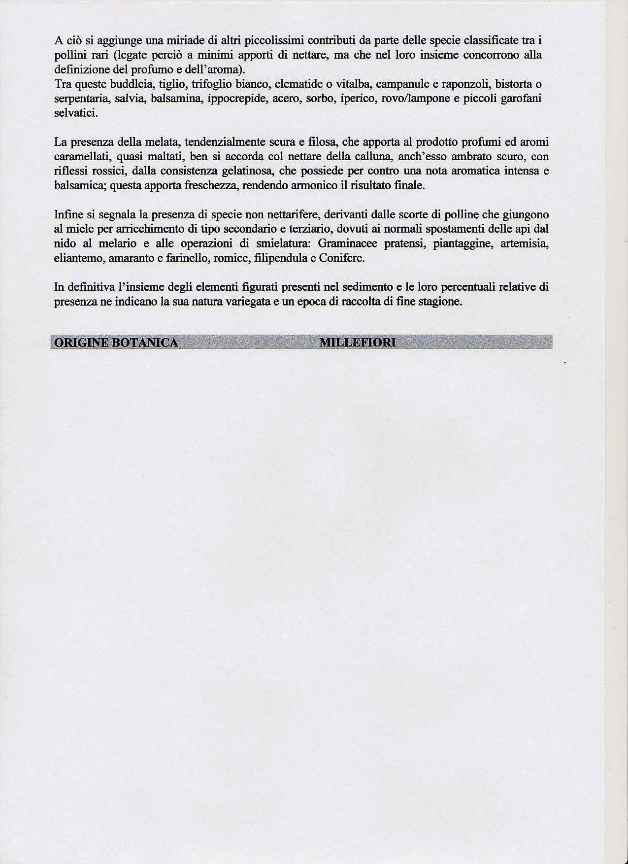In ogni confezione viene acclusa la certificazione dell'origine botanica e l'analisi palinologica qualitativa dei mieli di Tiglio e Millefiori compiuta nell'agosto 2014 dal Laboratorio Apistico dell'Istituto FOJANINI di Sondrio. (vedi sotto)