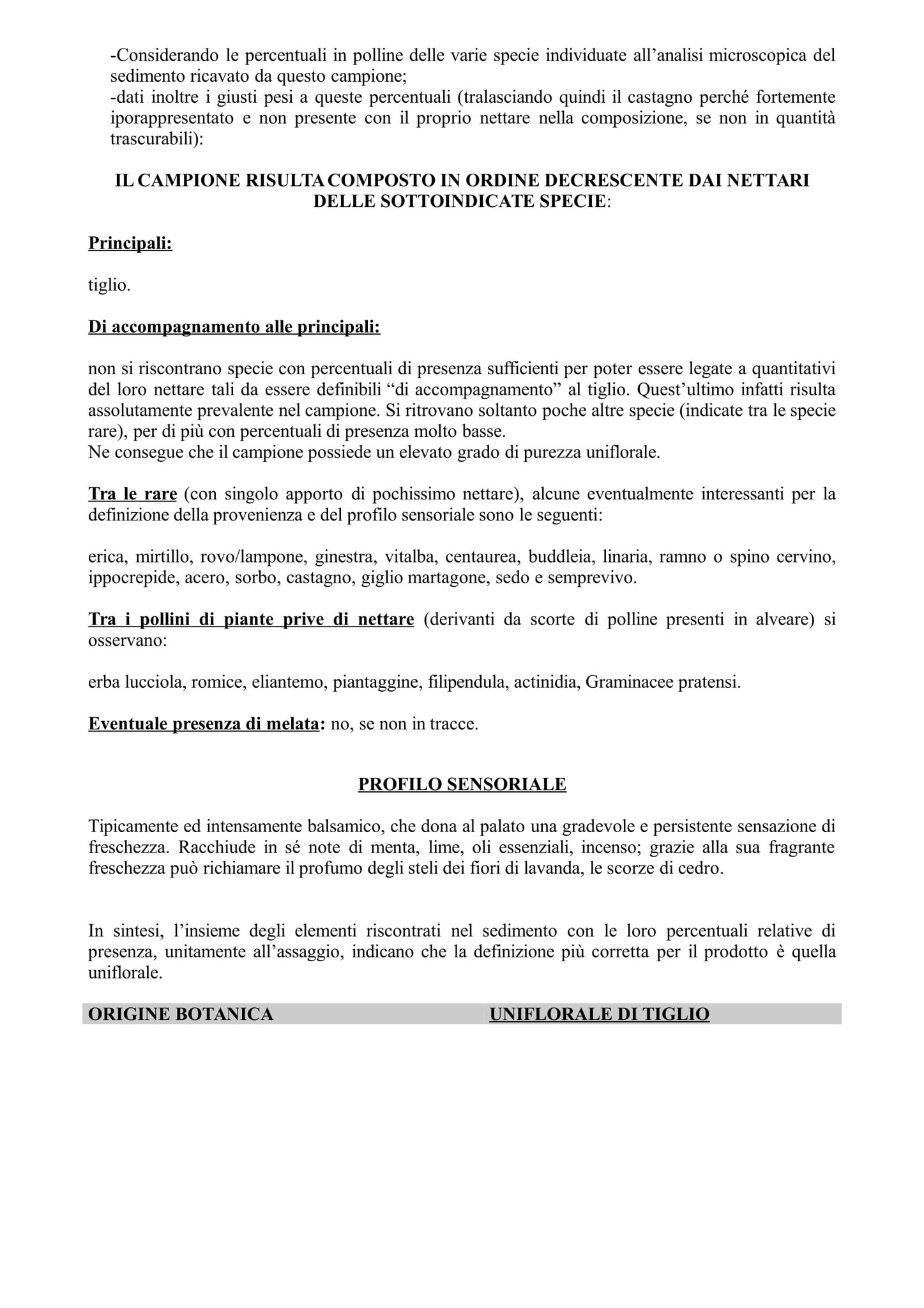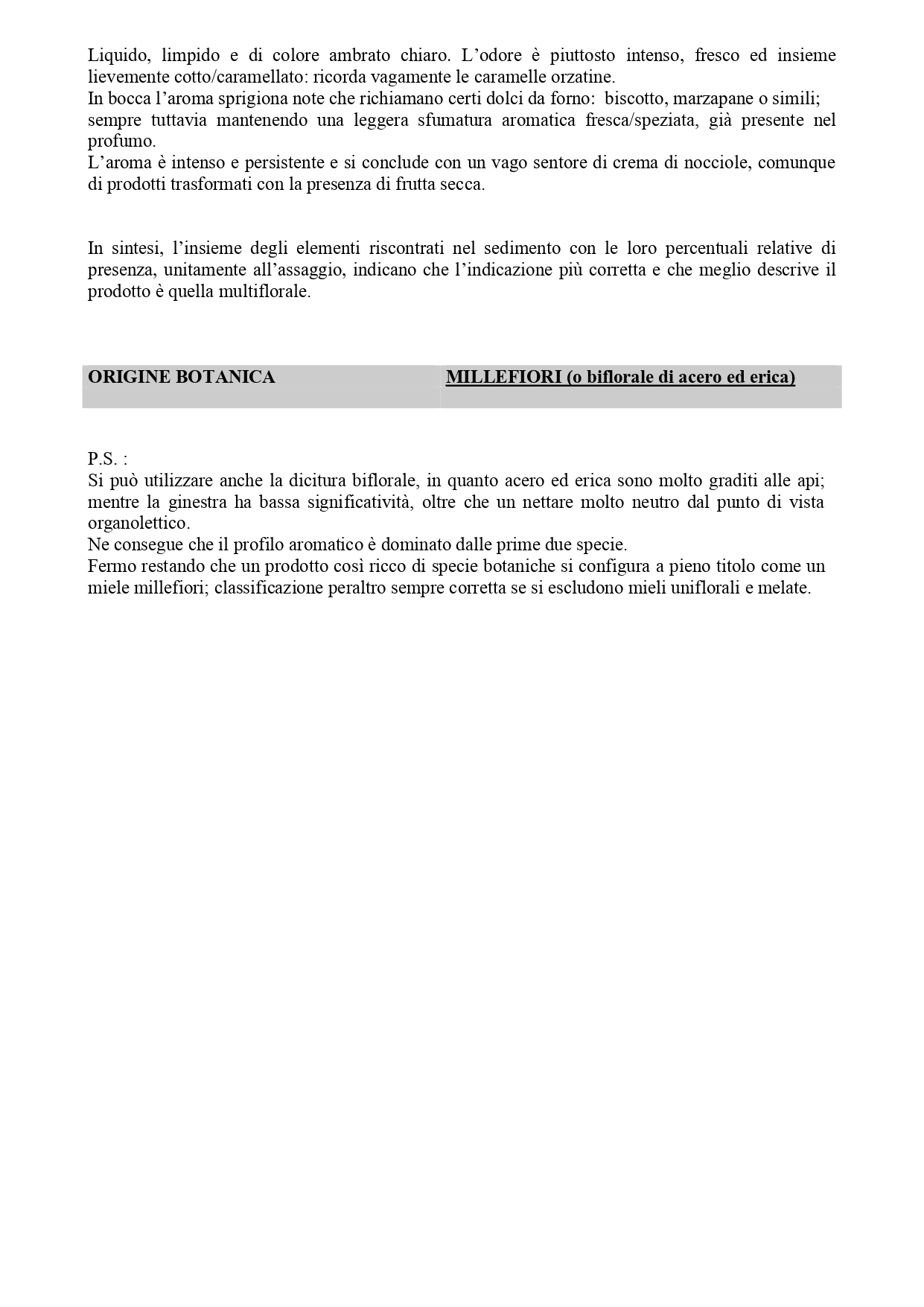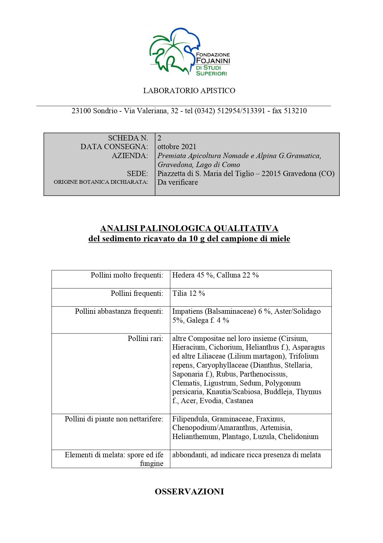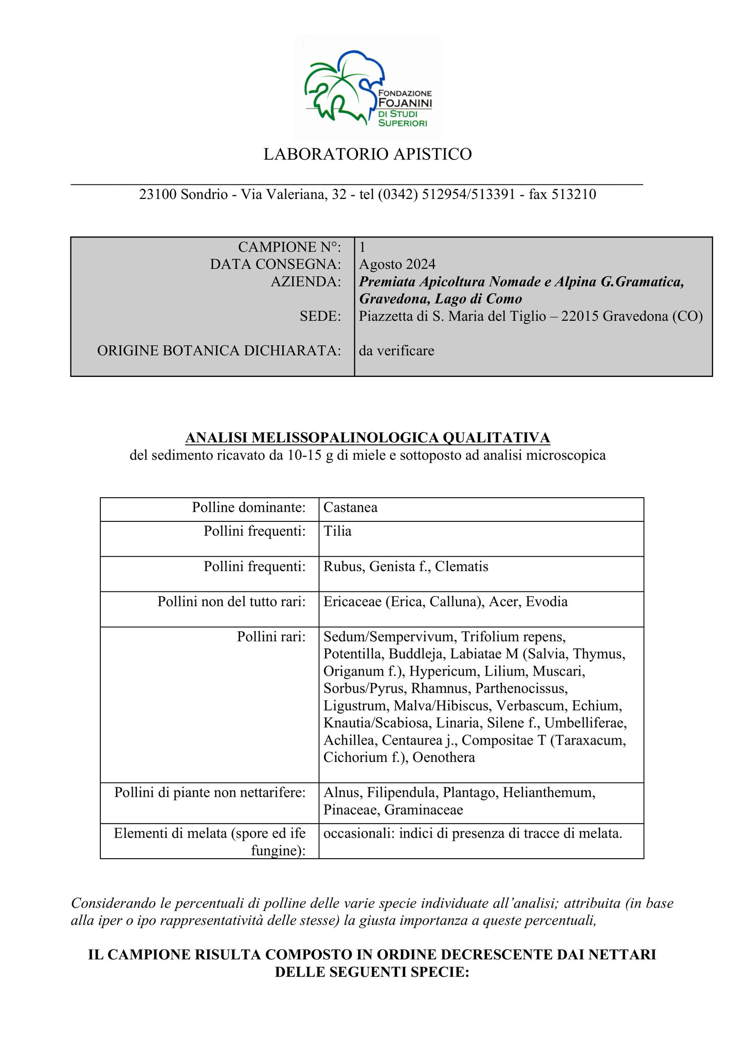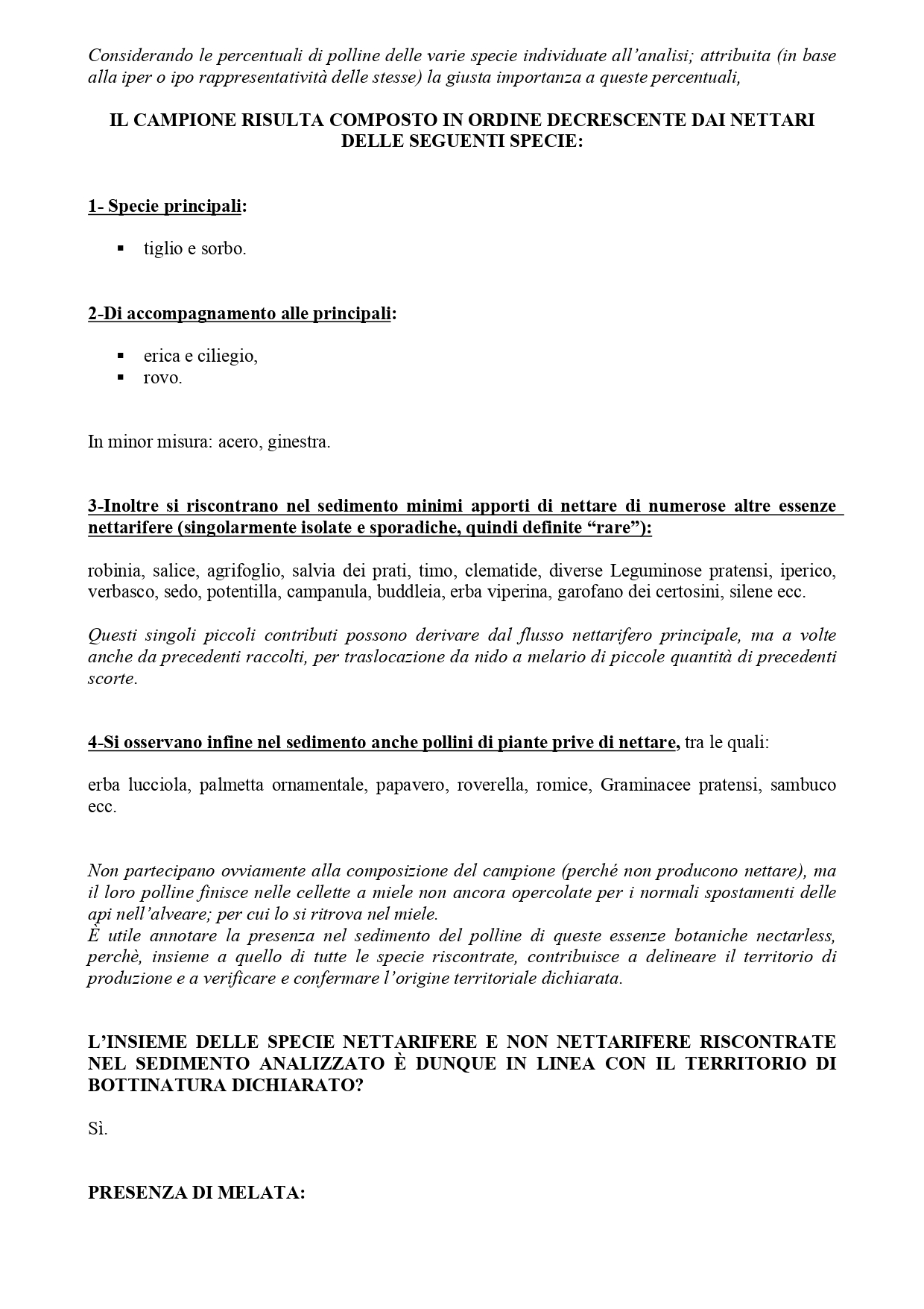 In ogni confezione viene acclusa la certificazione dell'origine botanica e l'analisi palinologica qualitativa dei mieli di Tiglio e Millefiori compiuta nell'agosto 2014 dal Laboratorio Apistico dell'Istituto FOJANINI di Sondrio. (vedi sotto)