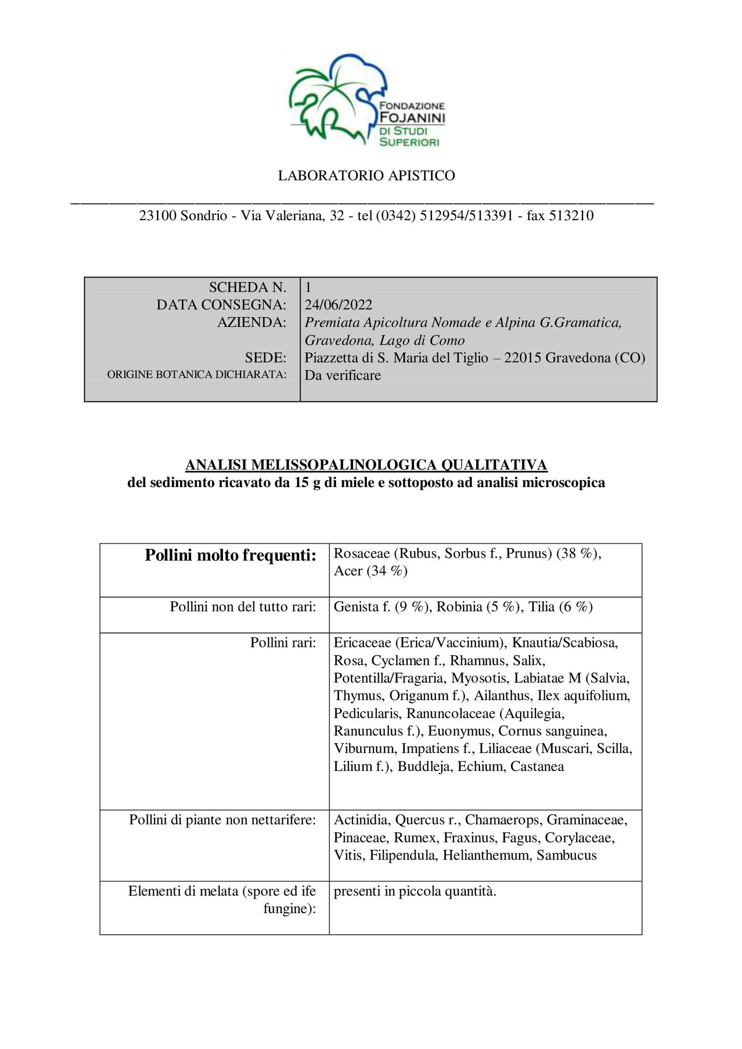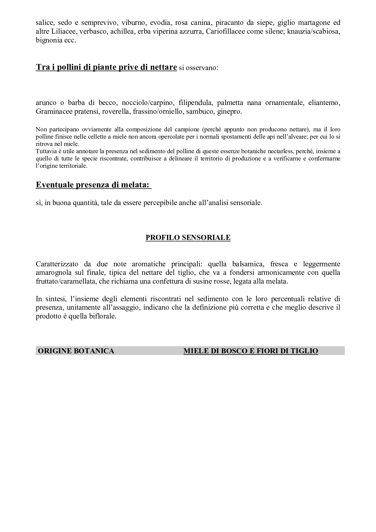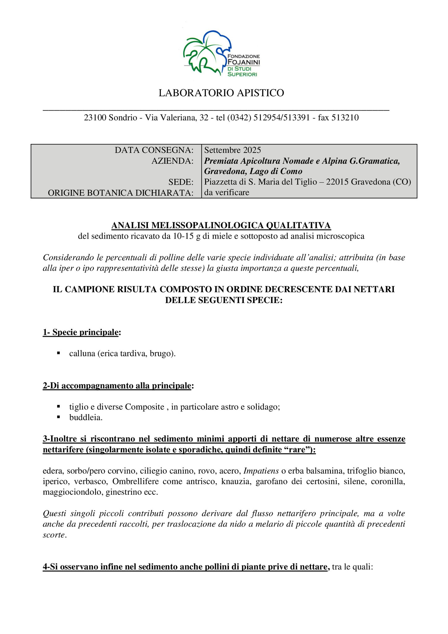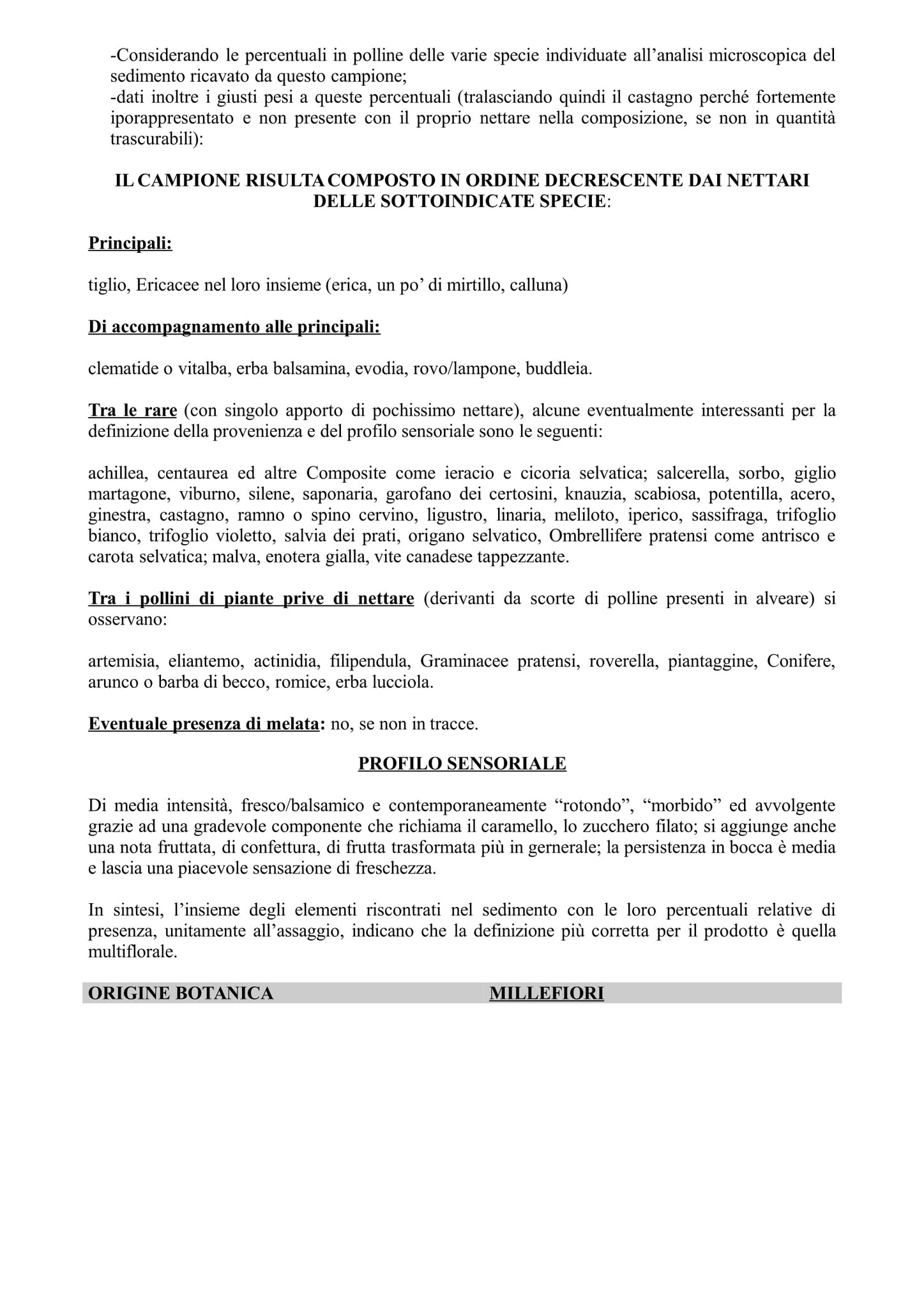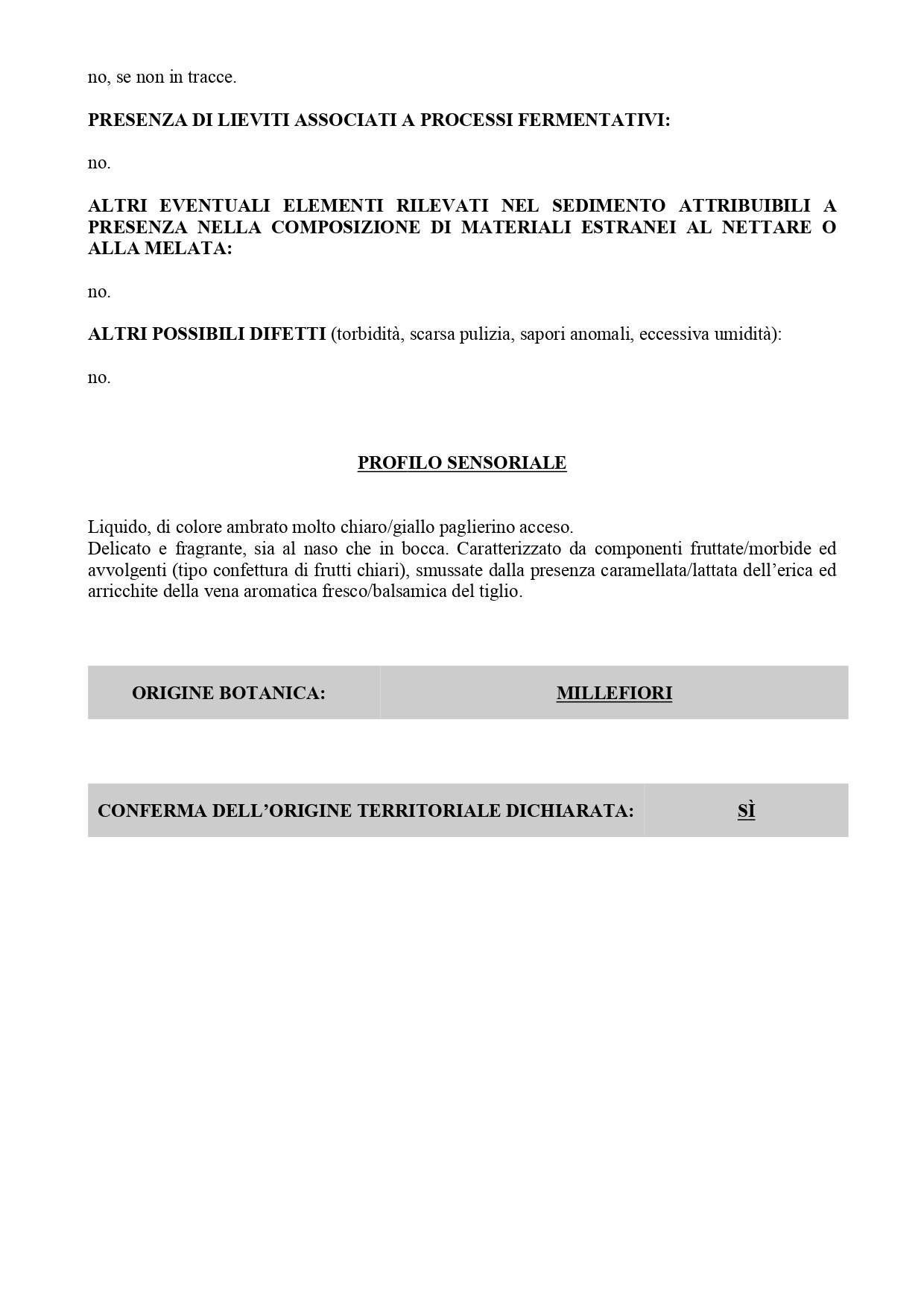 In ogni confezione viene acclusa la certificazione dell'origine botanica e l'analisi palinologica qualitativa dei mieli di Tiglio e Millefiori compiuta nell'agosto 2014 dal Laboratorio Apistico dell'Istituto FOJANINI di Sondrio. (vedi sotto)