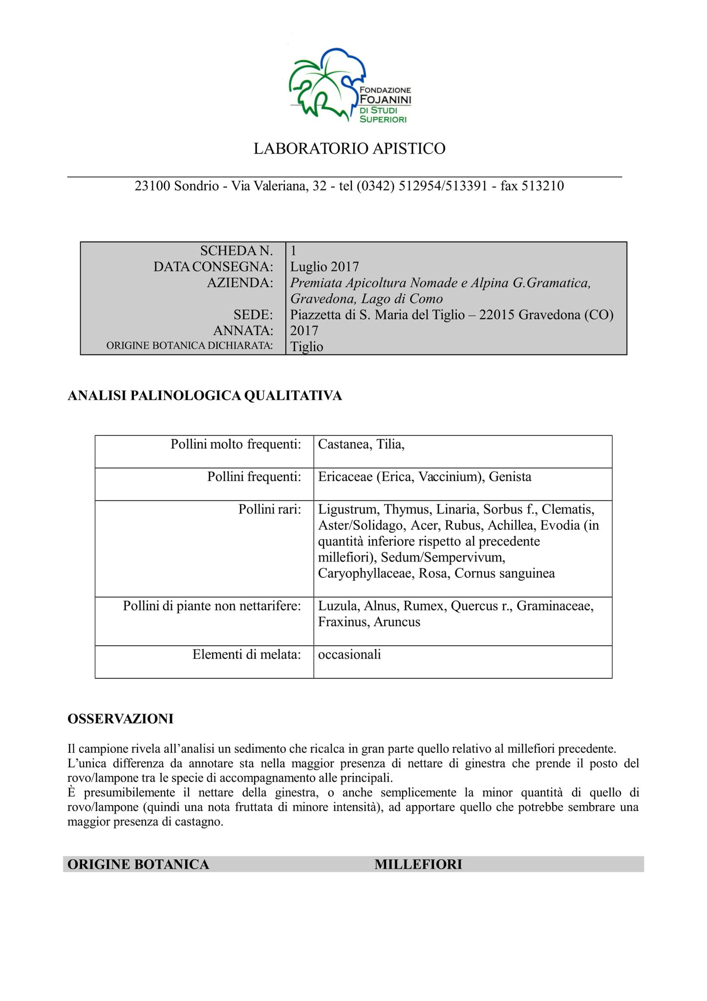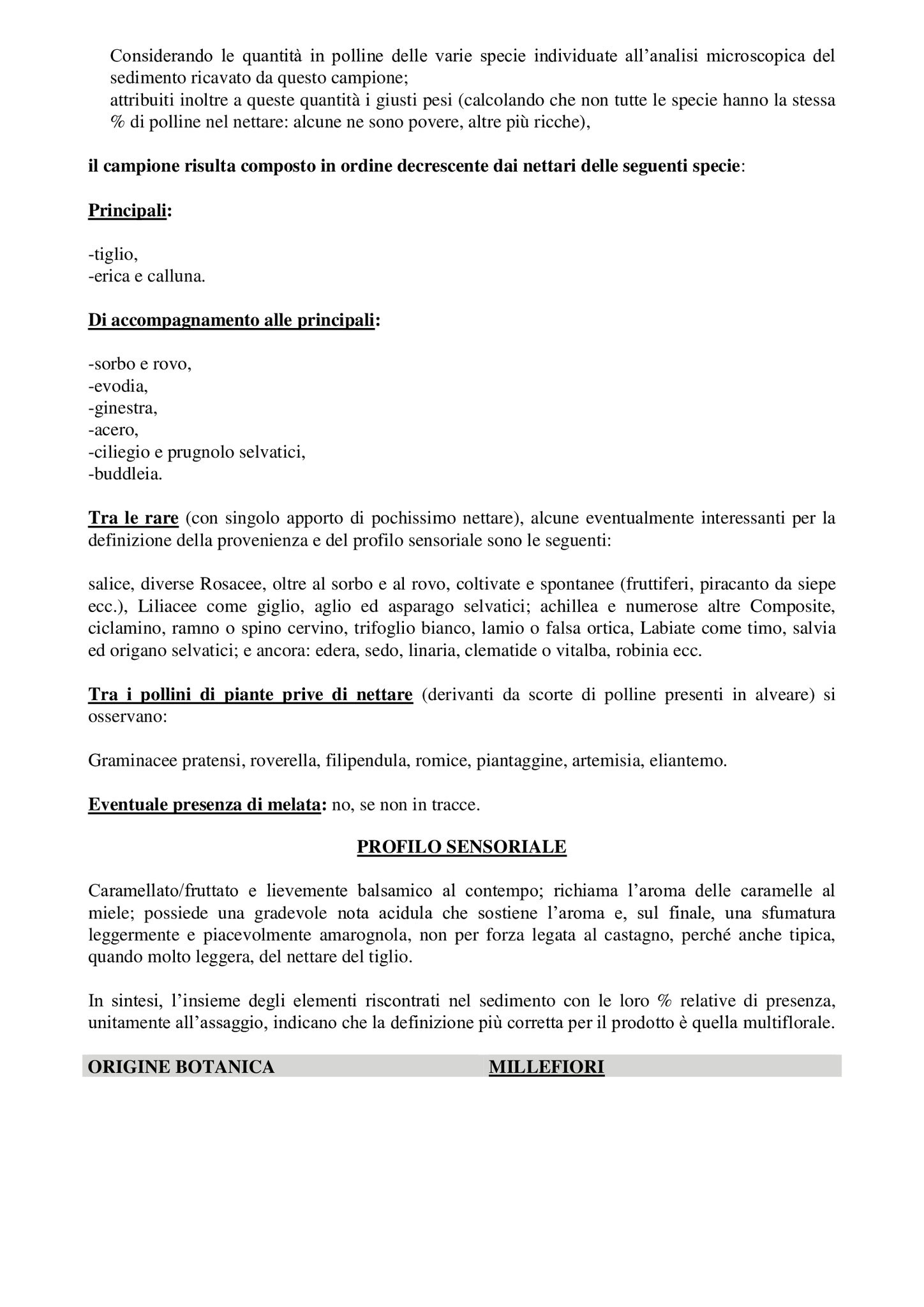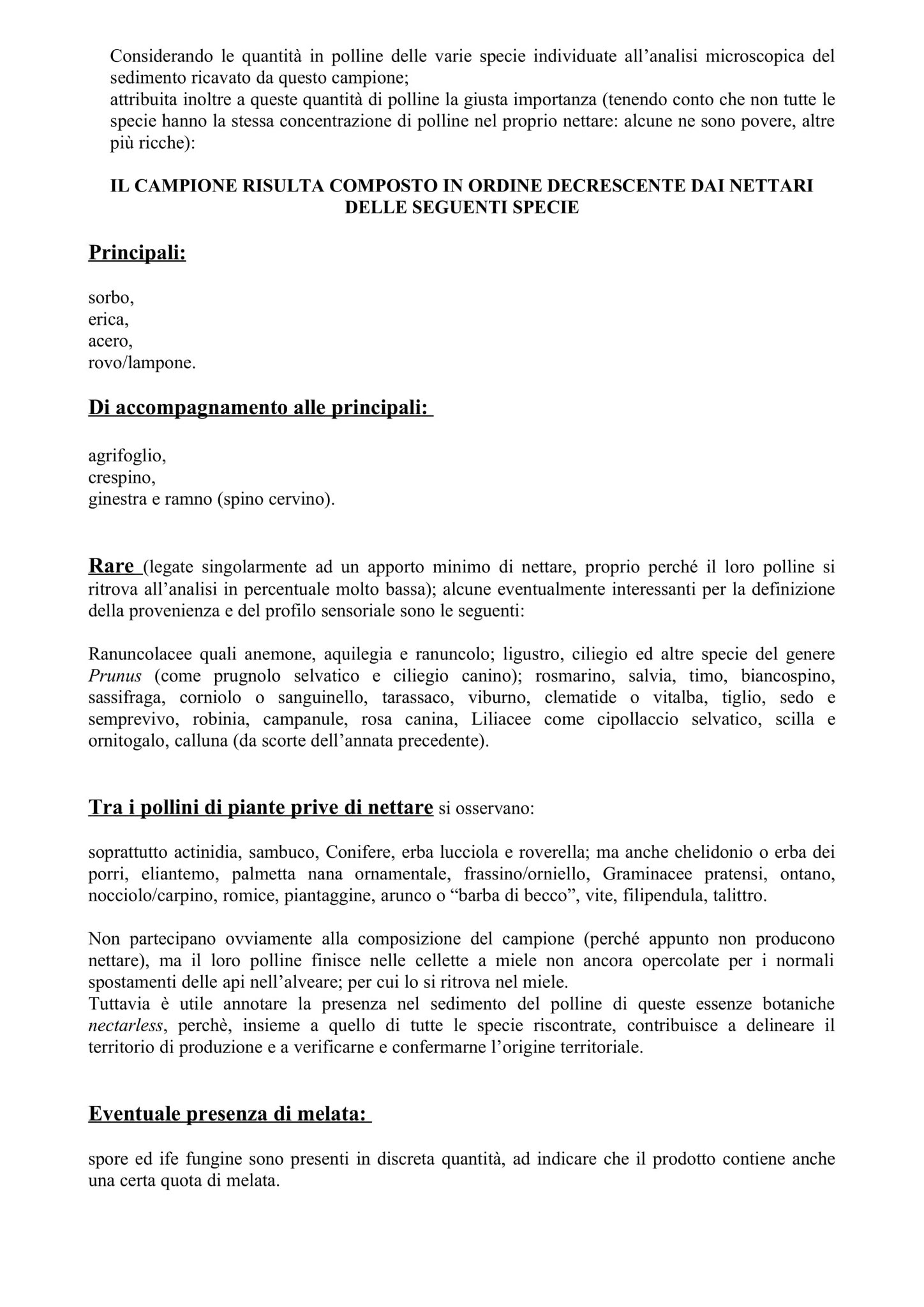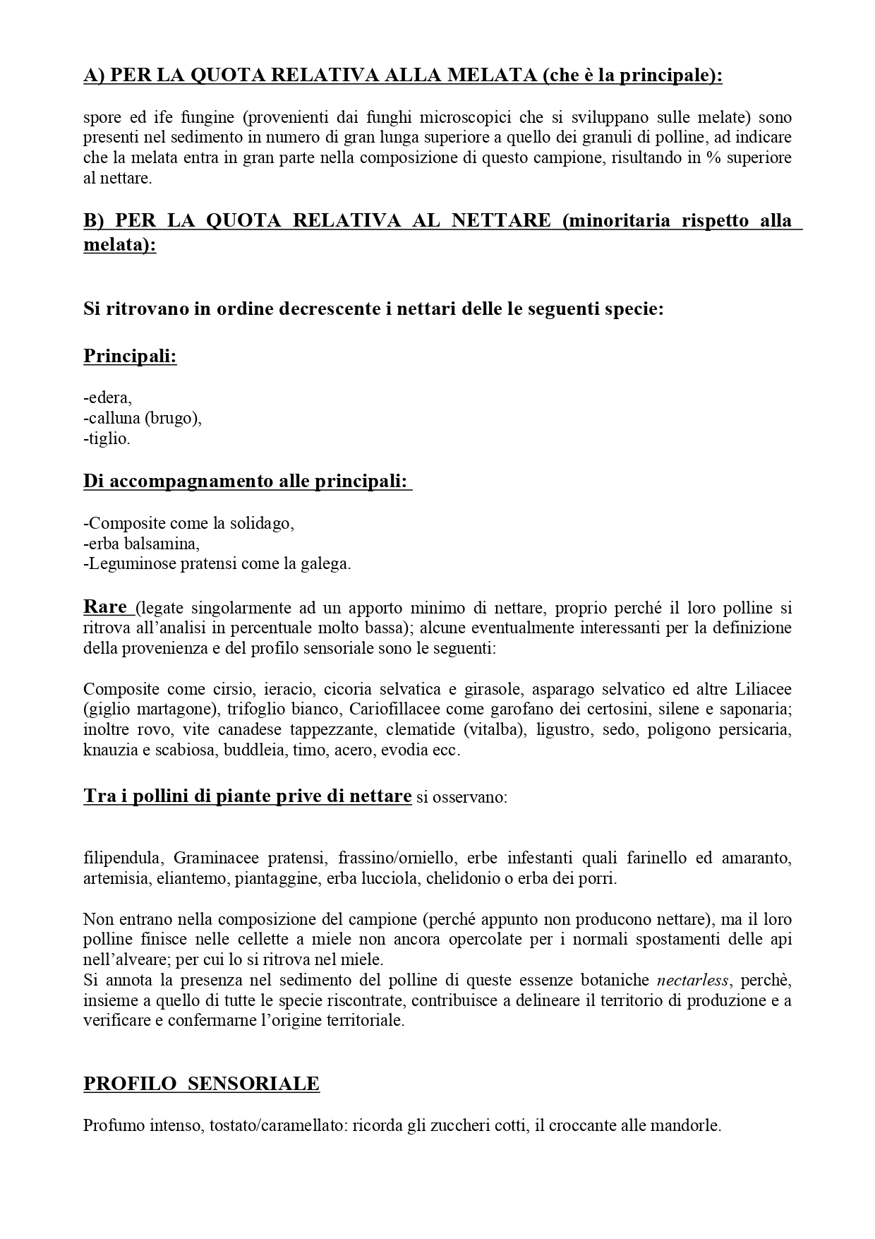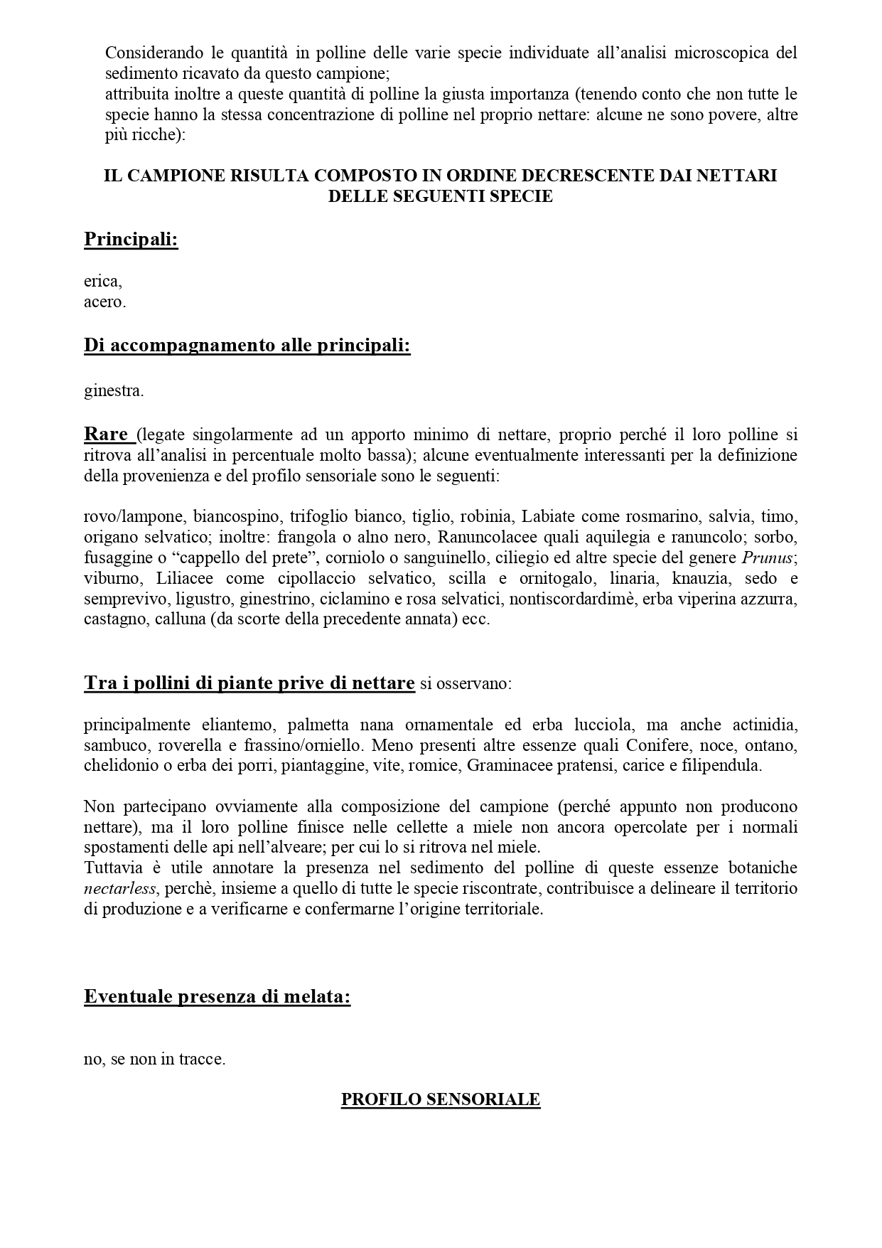 In ogni confezione viene acclusa la certificazione dell'origine botanica e l'analisi palinologica qualitativa dei mieli di Tiglio e Millefiori compiuta nell'agosto 2014 dal Laboratorio Apistico dell'Istituto FOJANINI di Sondrio. (vedi sotto)