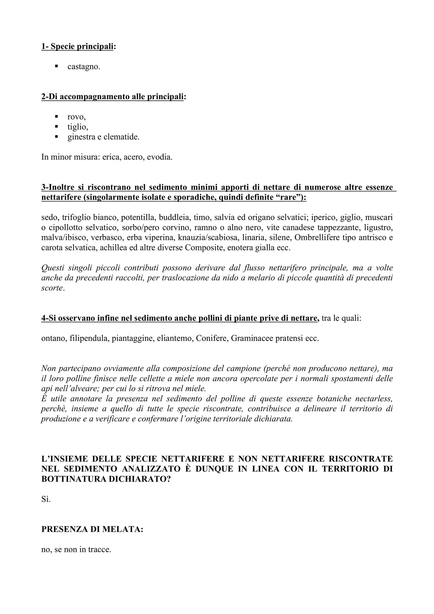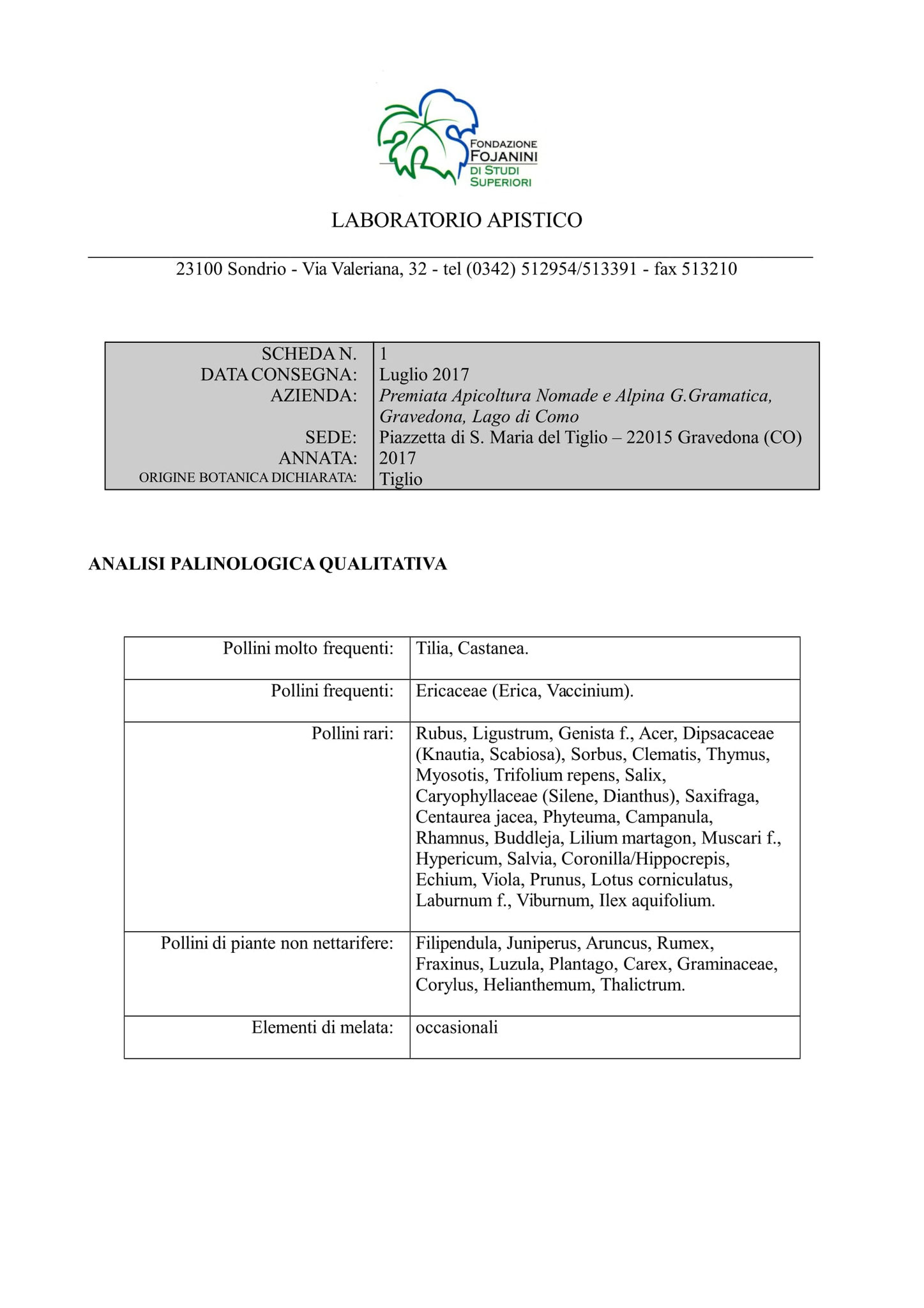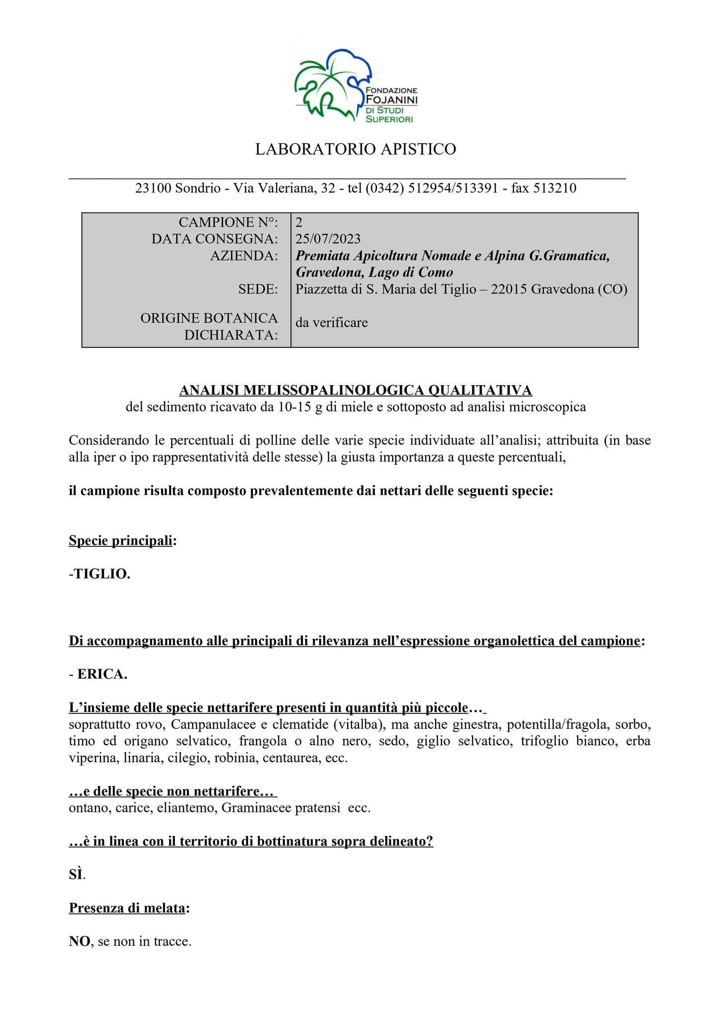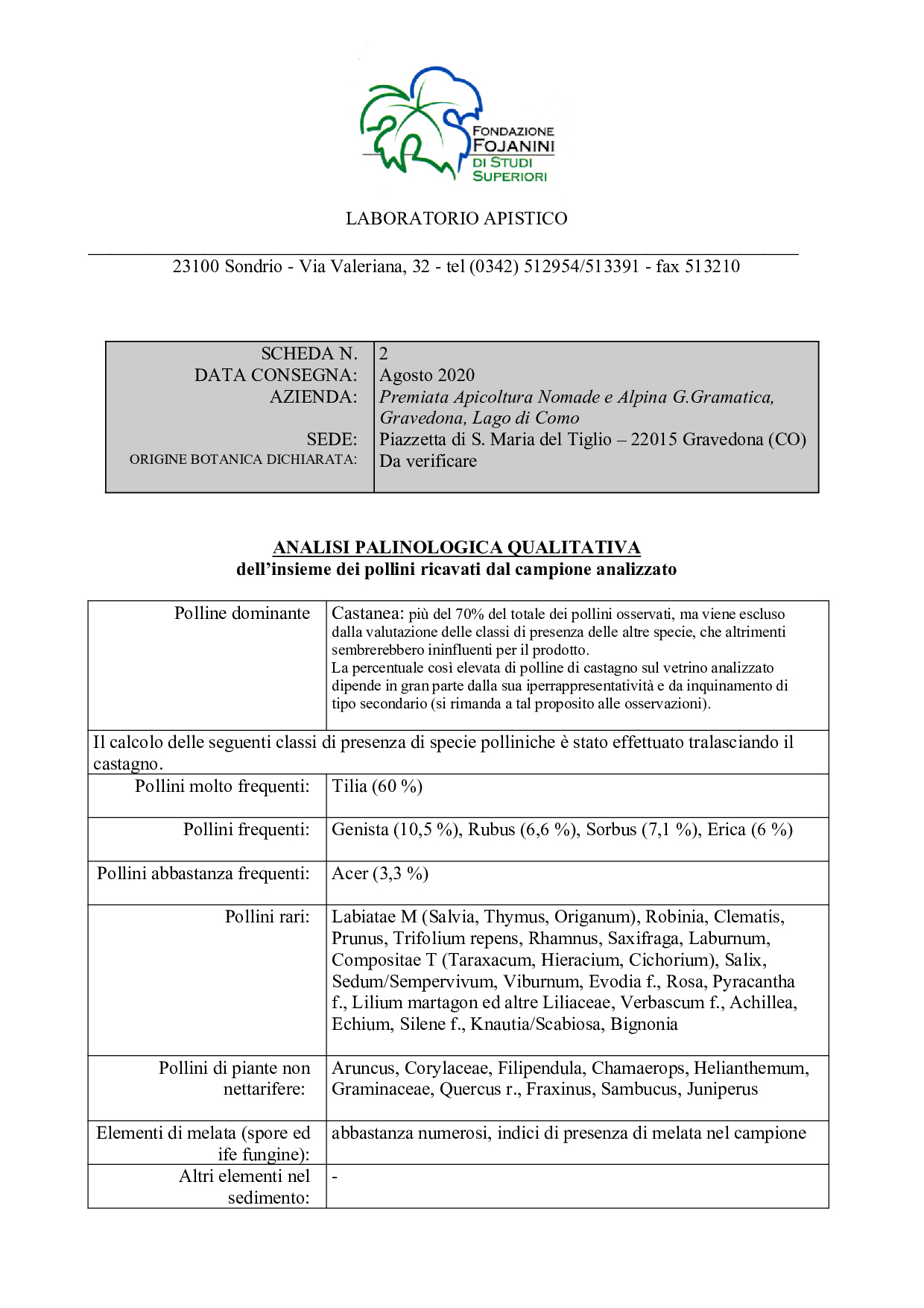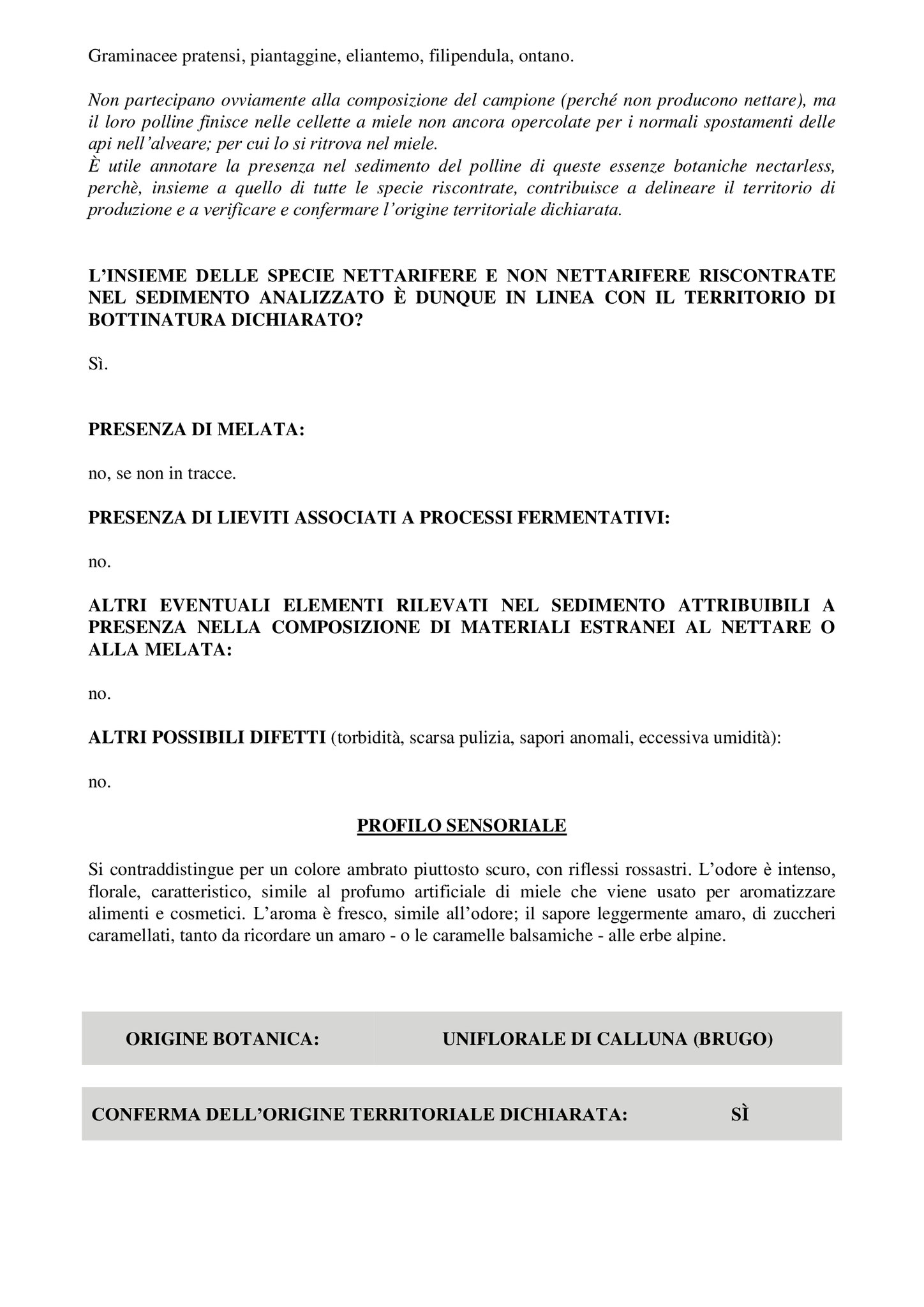 In ogni confezione viene acclusa la certificazione dell'origine botanica e l'analisi palinologica qualitativa dei mieli di Tiglio e Millefiori compiuta nell'agosto 2014 dal Laboratorio Apistico dell'Istituto FOJANINI di Sondrio. (vedi sotto)