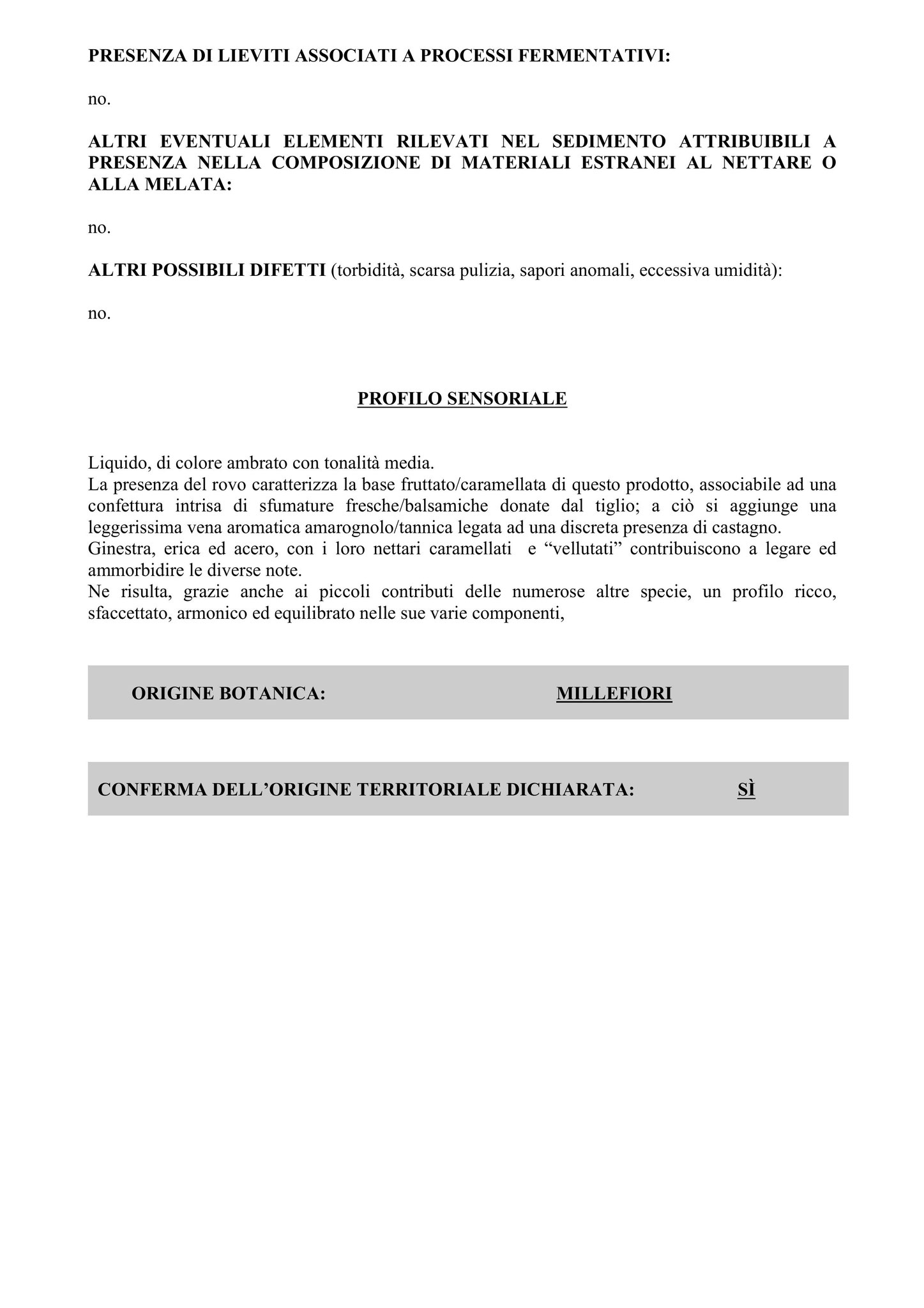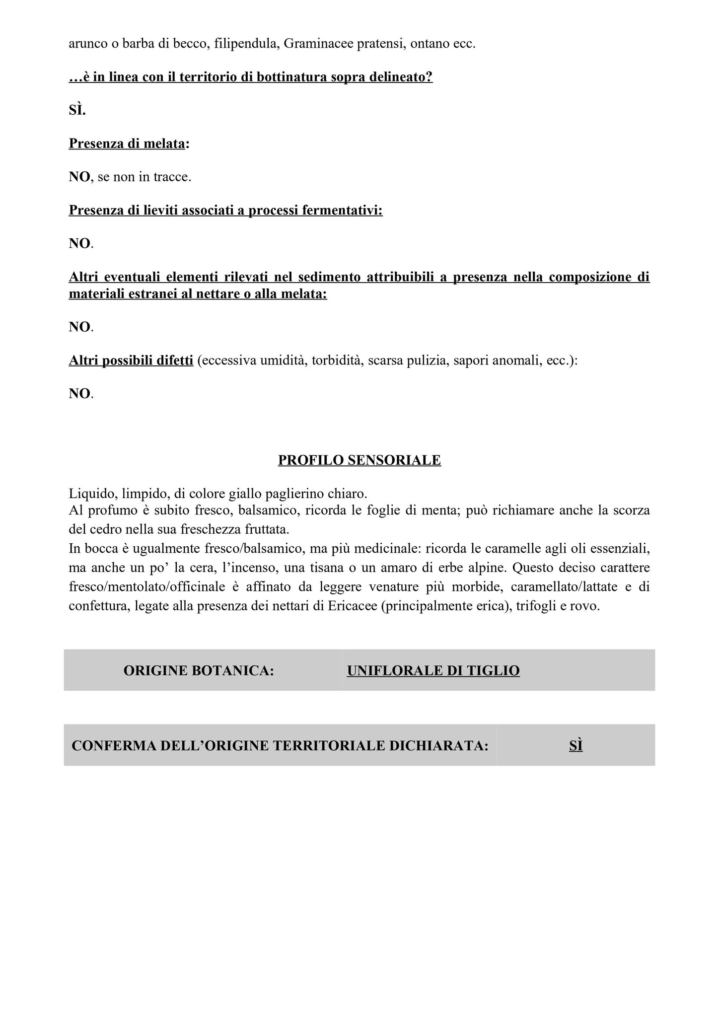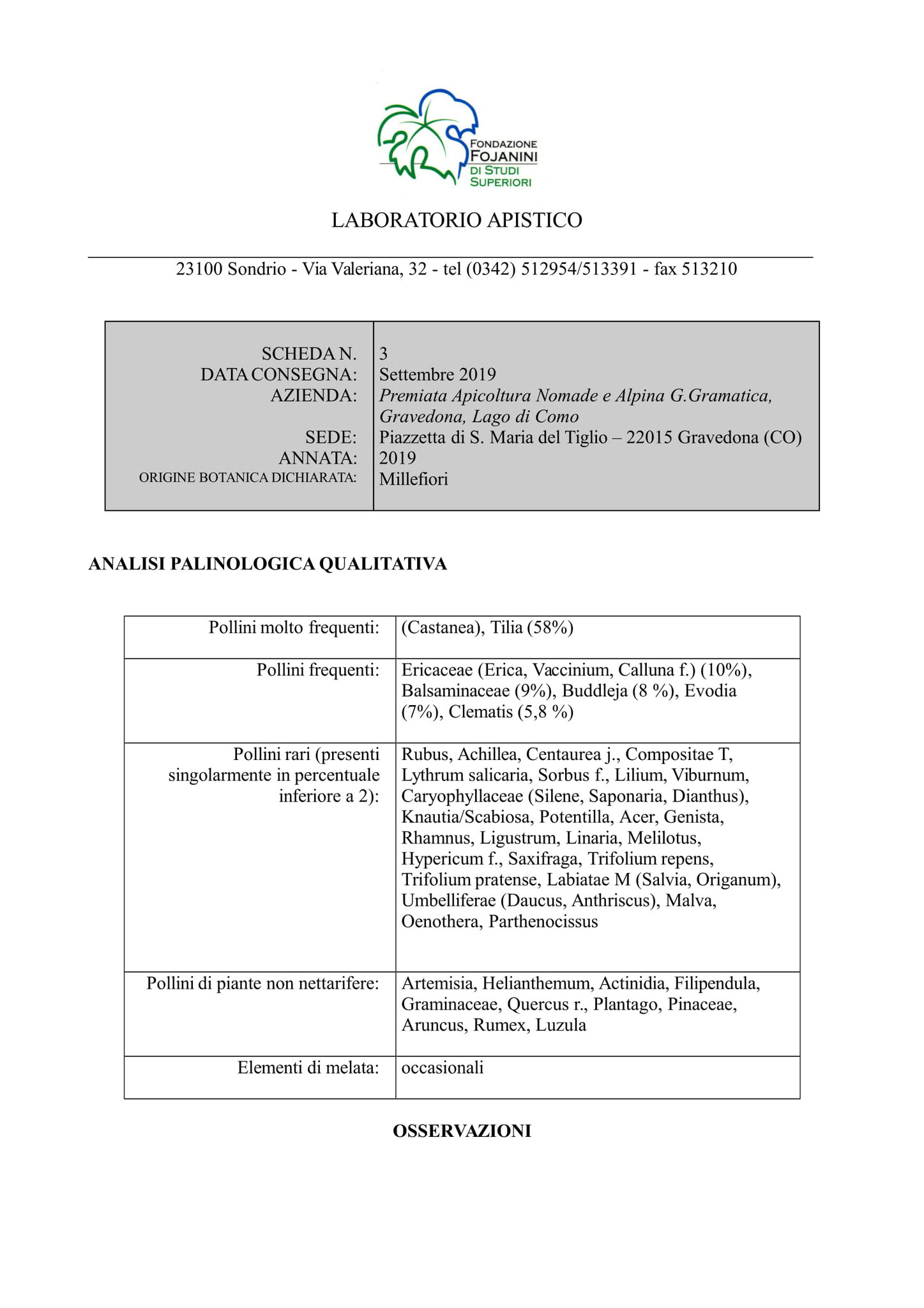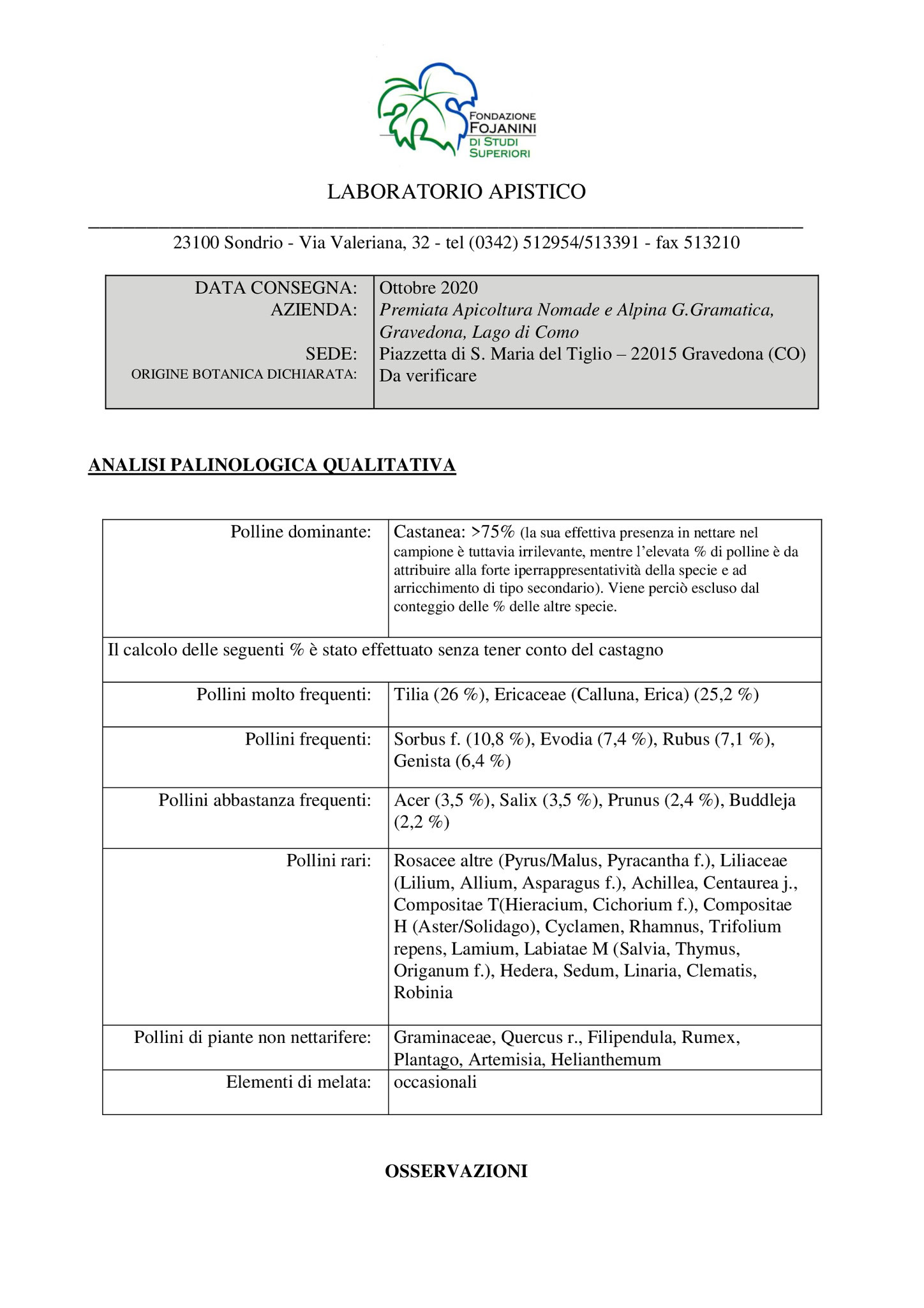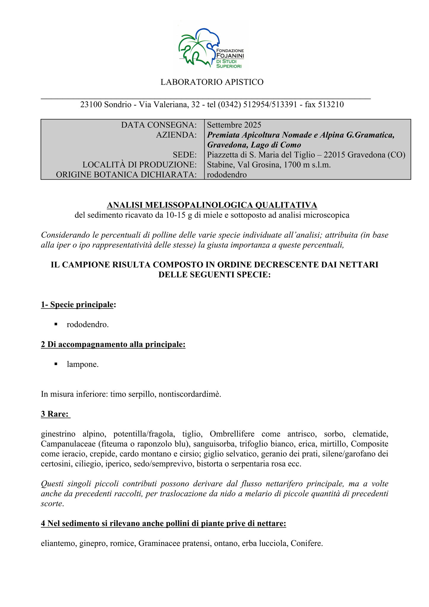 In ogni confezione viene acclusa la certificazione dell'origine botanica e l'analisi palinologica qualitativa dei mieli di Tiglio e Millefiori compiuta nell'agosto 2014 dal Laboratorio Apistico dell'Istituto FOJANINI di Sondrio. (vedi sotto)