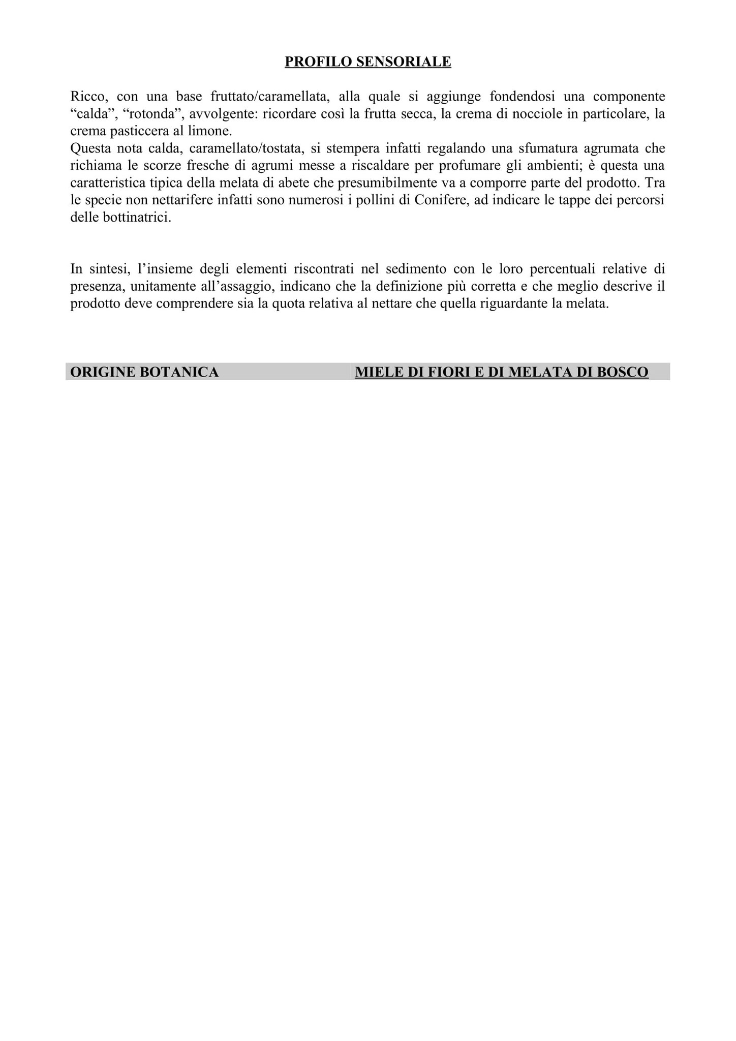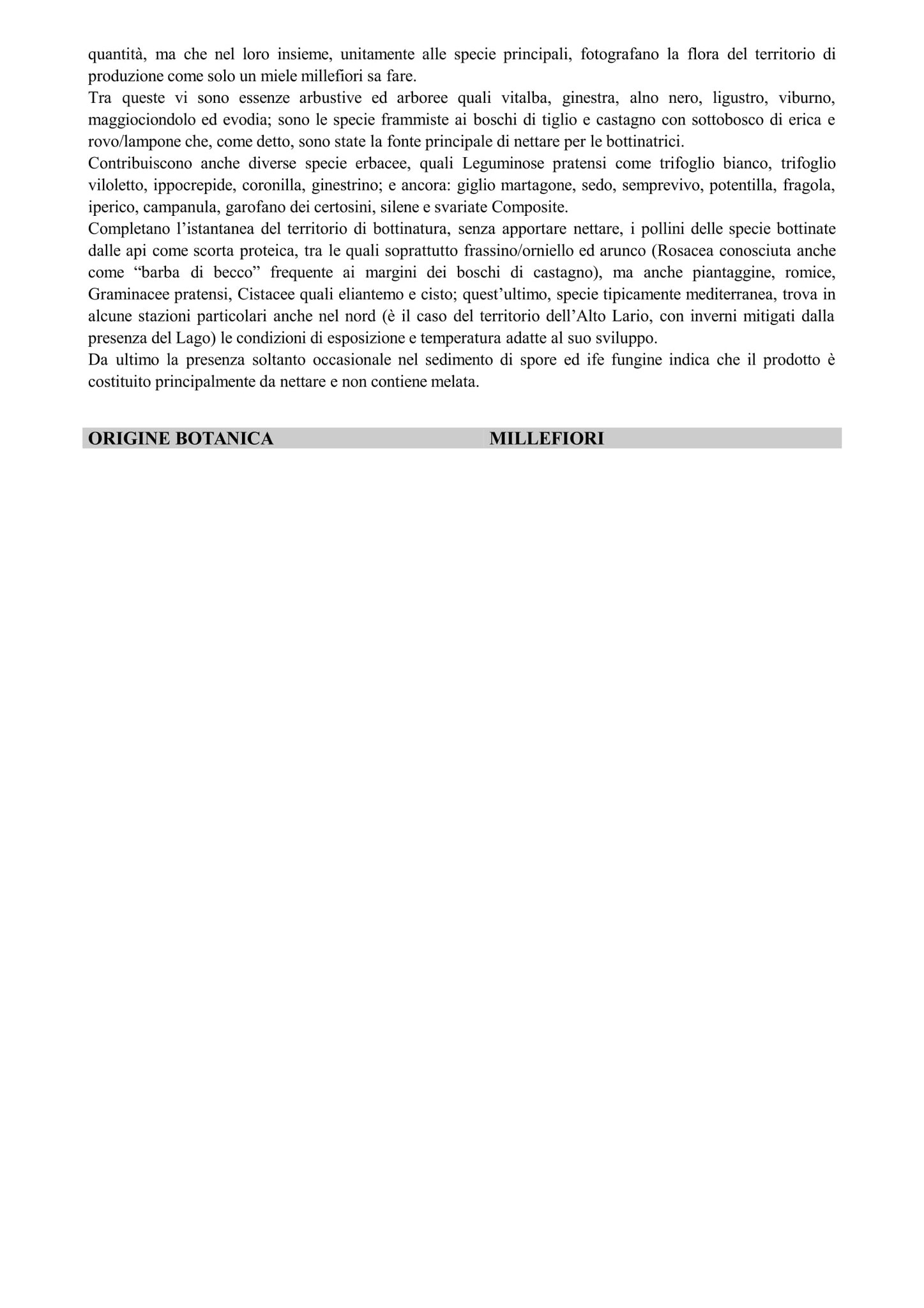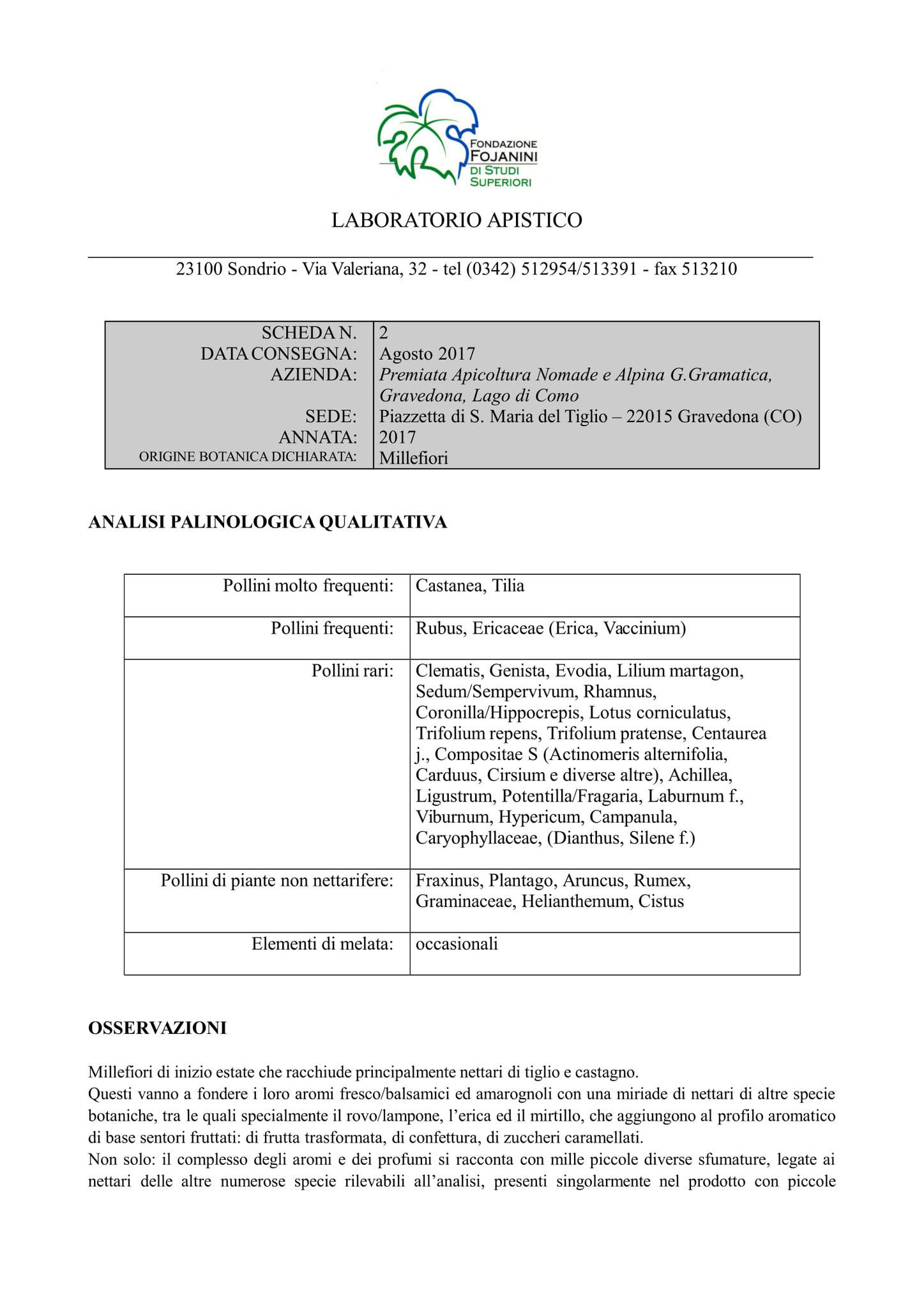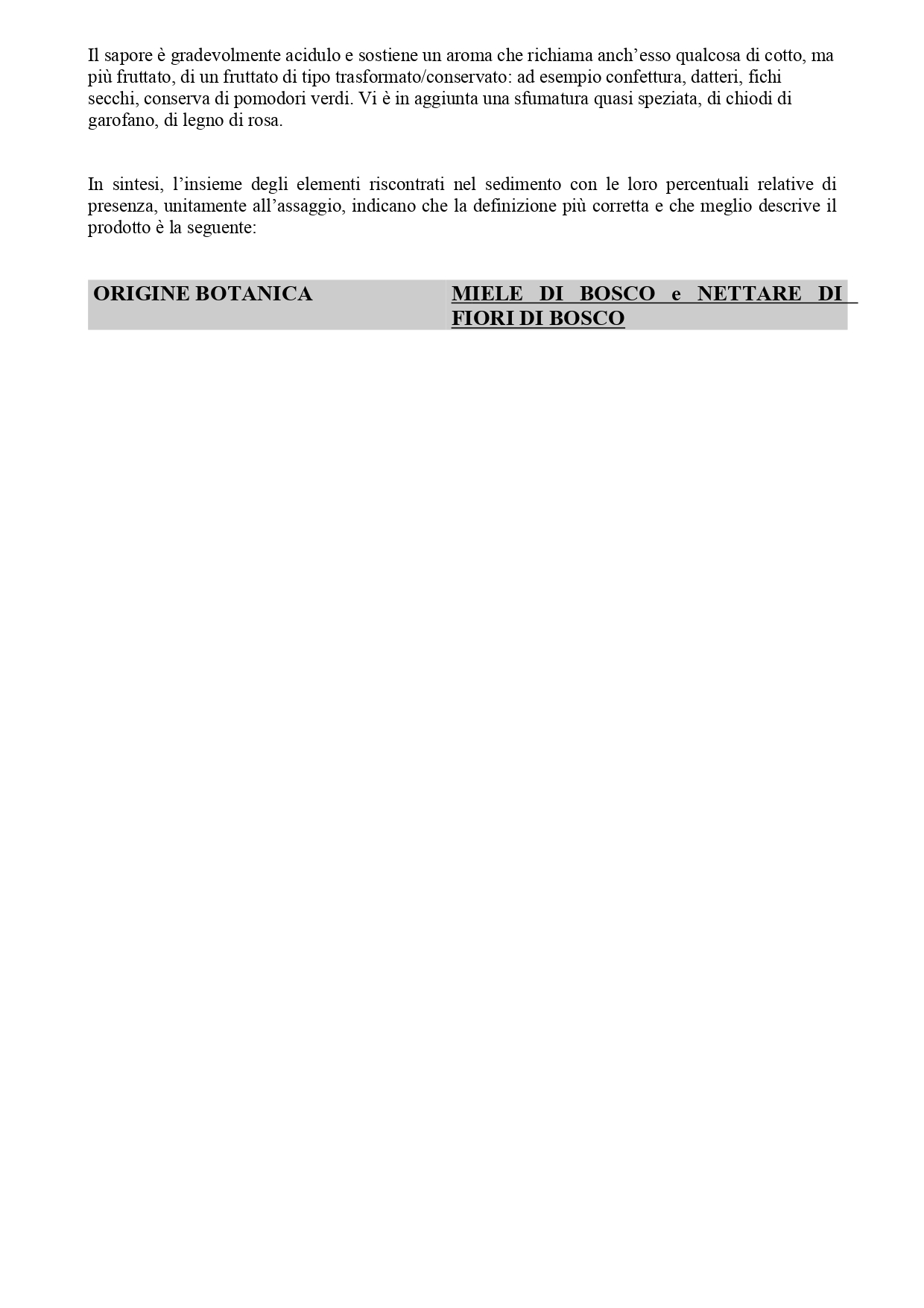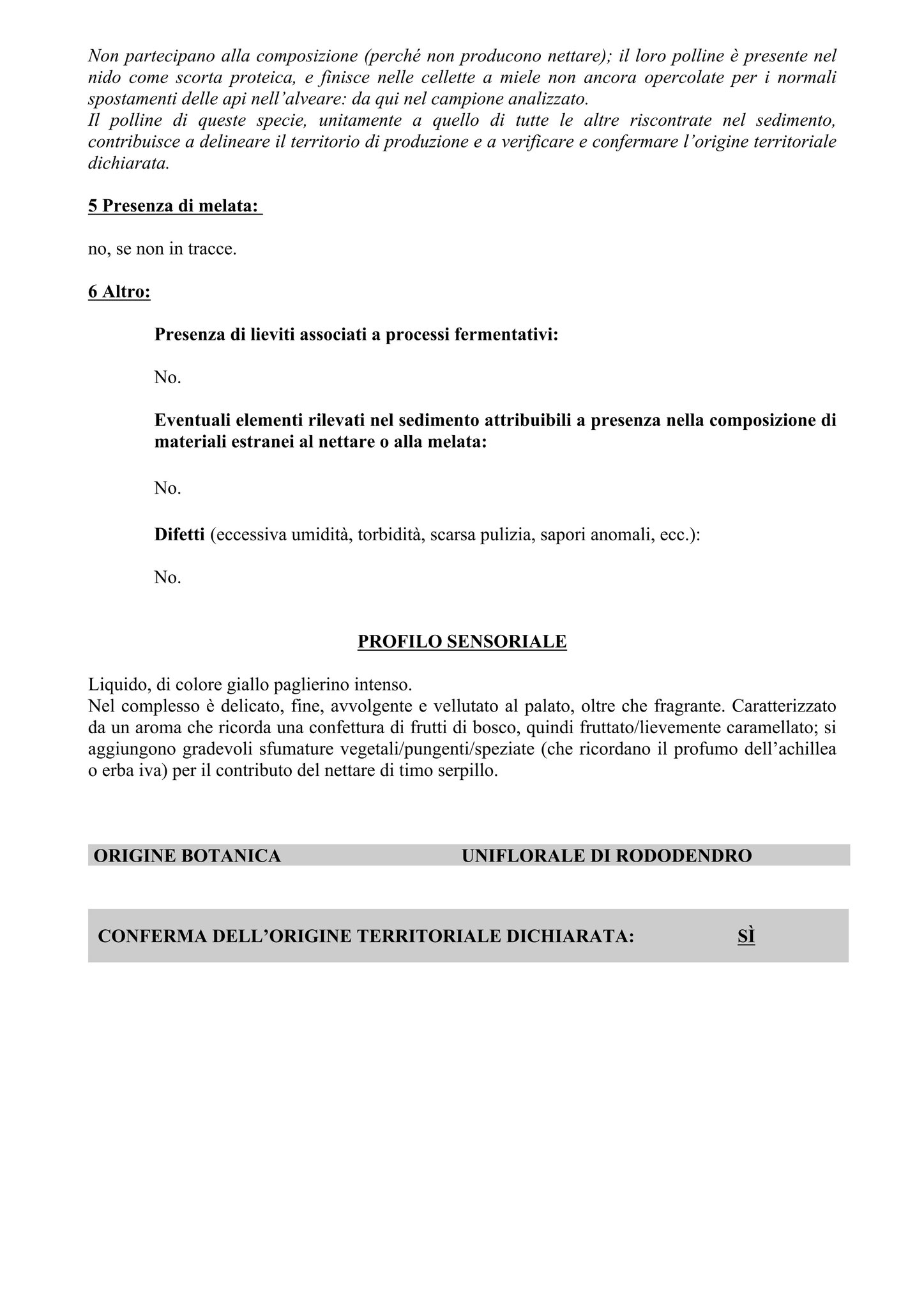 In ogni confezione viene acclusa la certificazione dell'origine botanica e l'analisi palinologica qualitativa dei mieli di Tiglio e Millefiori compiuta nell'agosto 2014 dal Laboratorio Apistico dell'Istituto FOJANINI di Sondrio. (vedi sotto)
