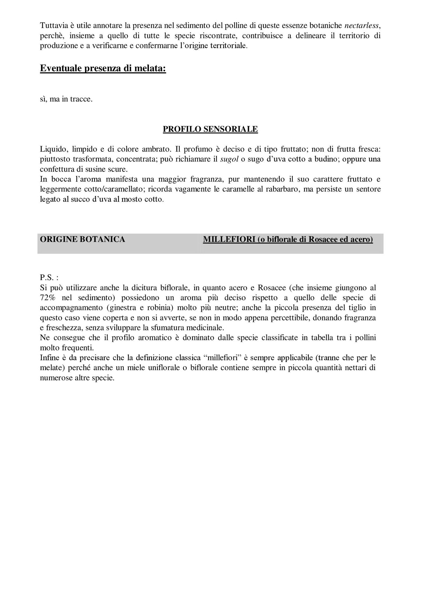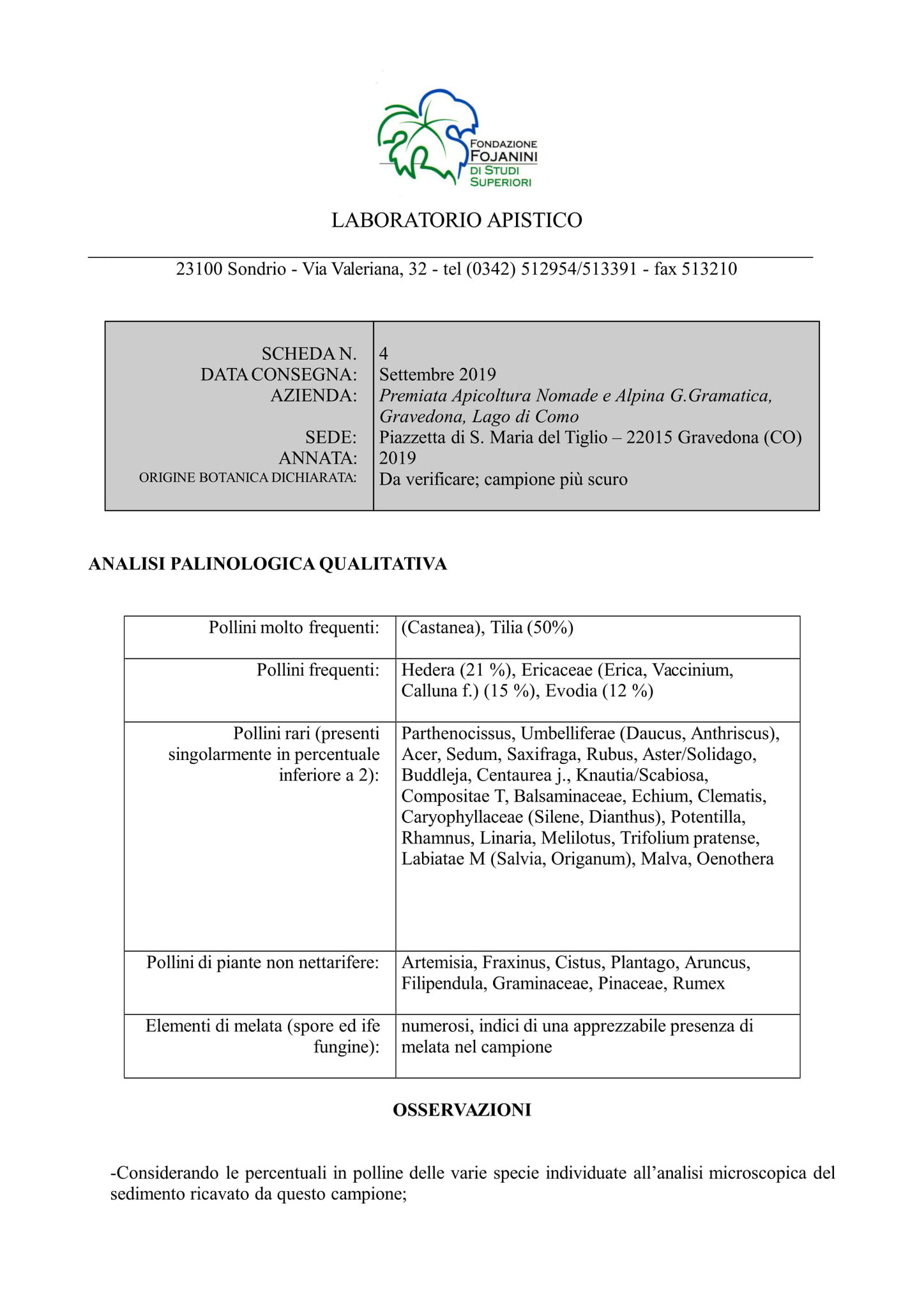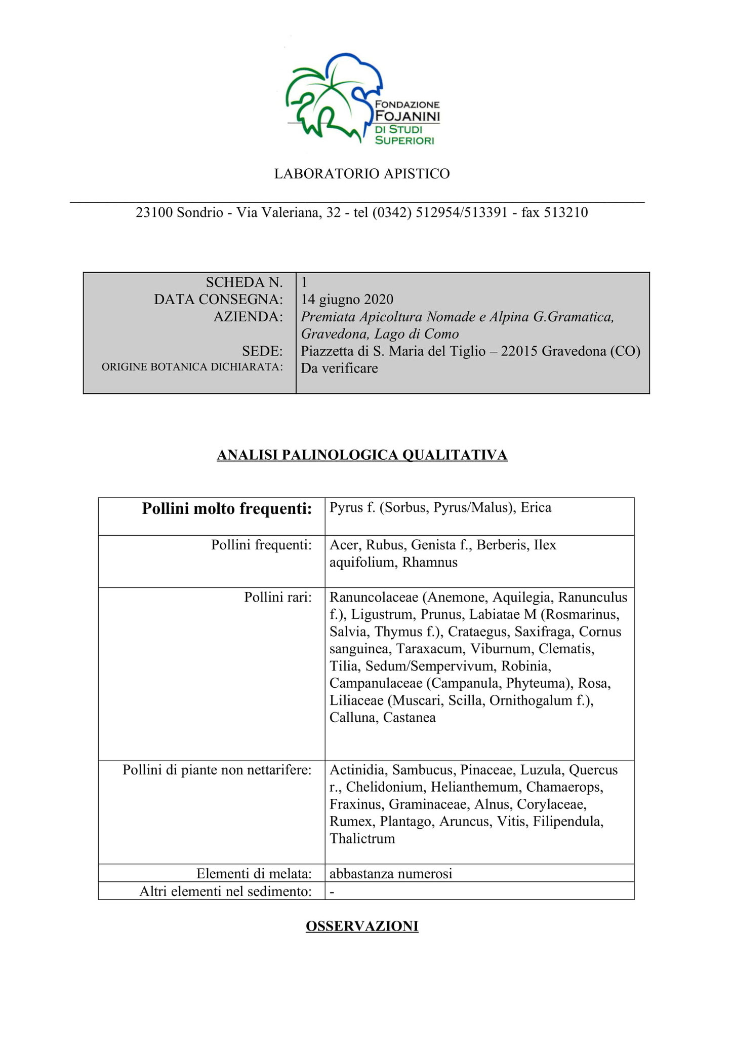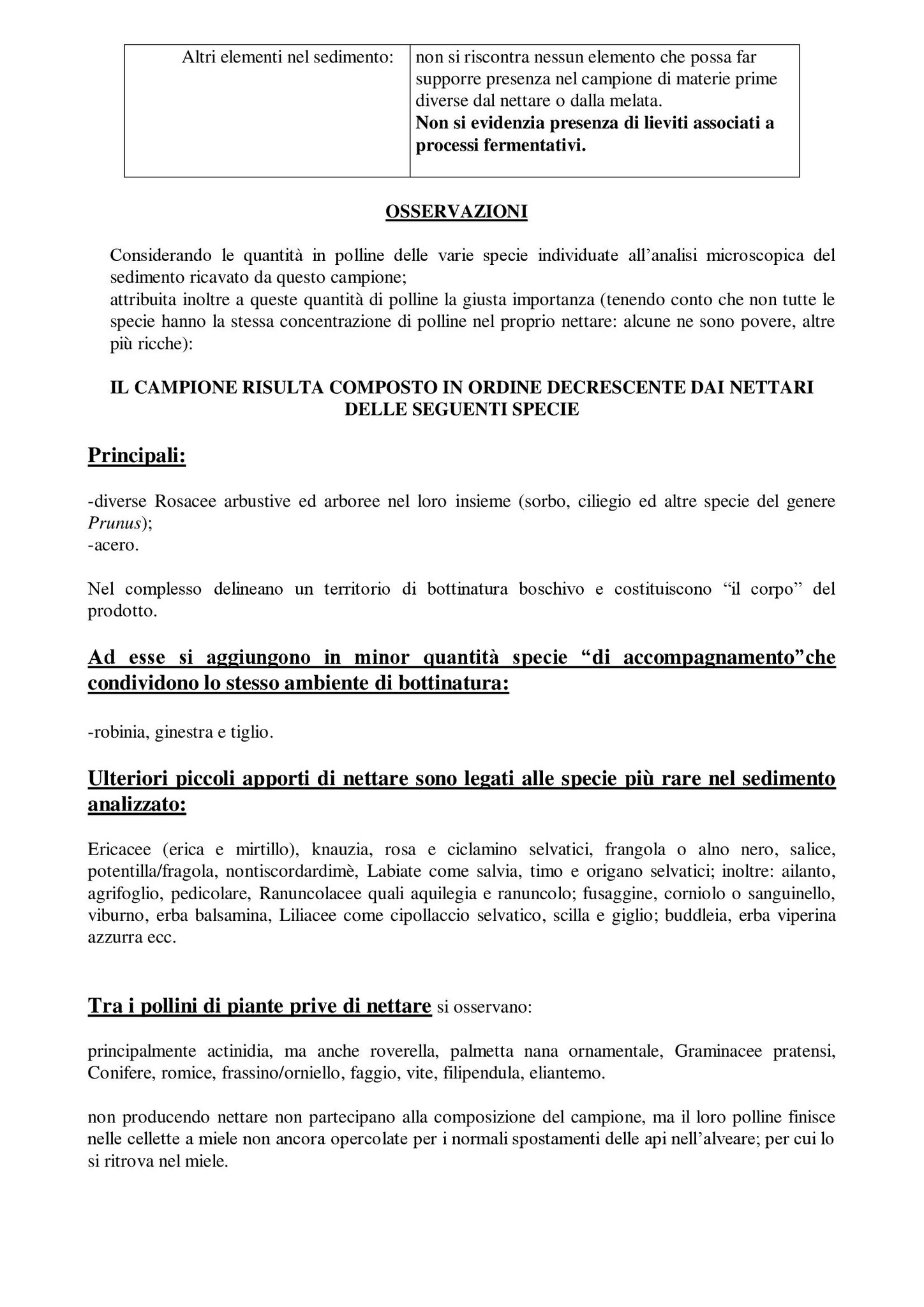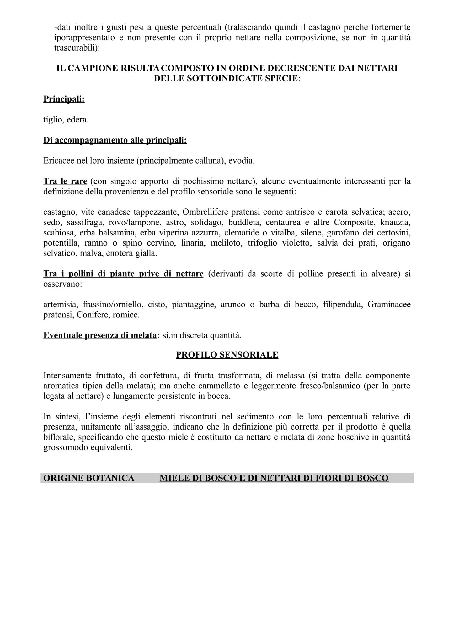 In ogni confezione viene acclusa la certificazione dell'origine botanica e l'analisi palinologica qualitativa dei mieli di Tiglio e Millefiori compiuta nell'agosto 2014 dal Laboratorio Apistico dell'Istituto FOJANINI di Sondrio. (vedi sotto)